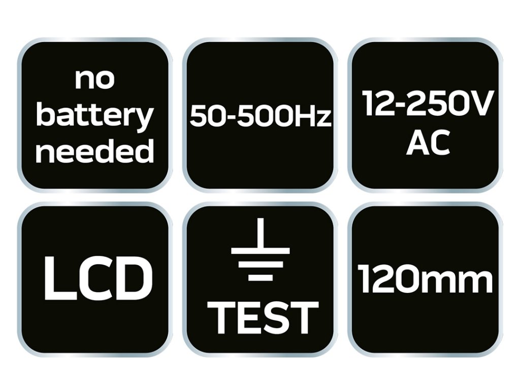 Digitálna skúšačka napätia 12-250 V AC, 50-500 Hz, 120 mm, plochý hrot, bez potreby napájania z batérie, digitálny displej, vreckový klip, funkcie: kontrola hodnôt napätia v zásuvkách, vyhľadávanie porúch v izolovaných striedavých kábloch, kontrola fázy v zásuvkách