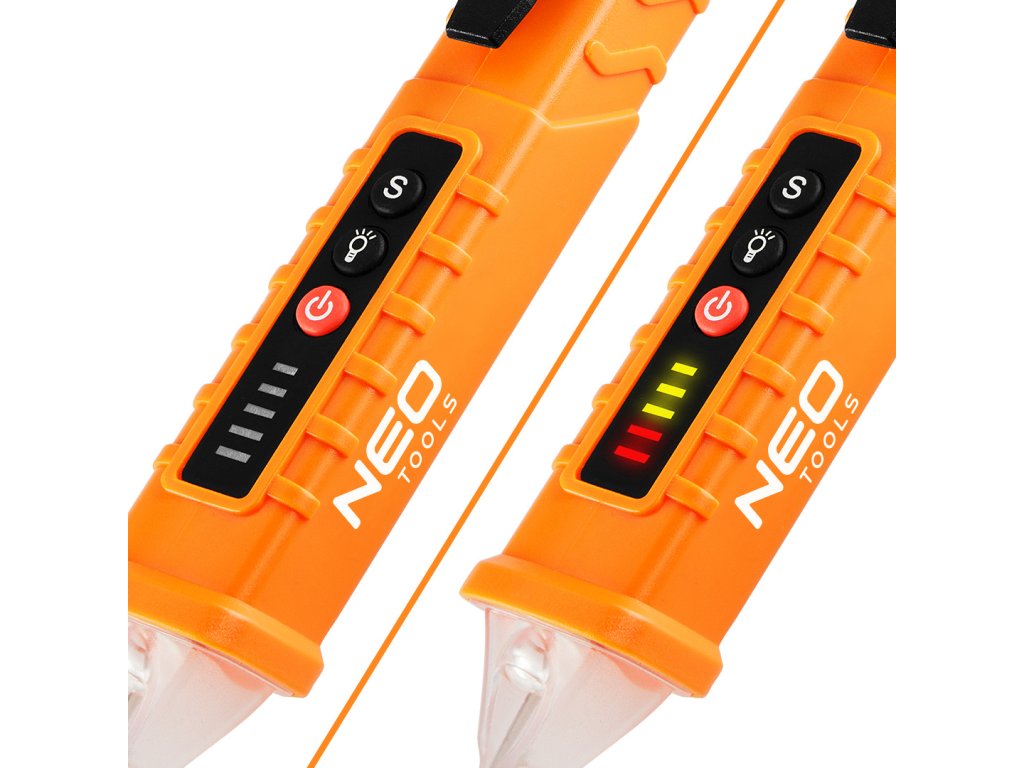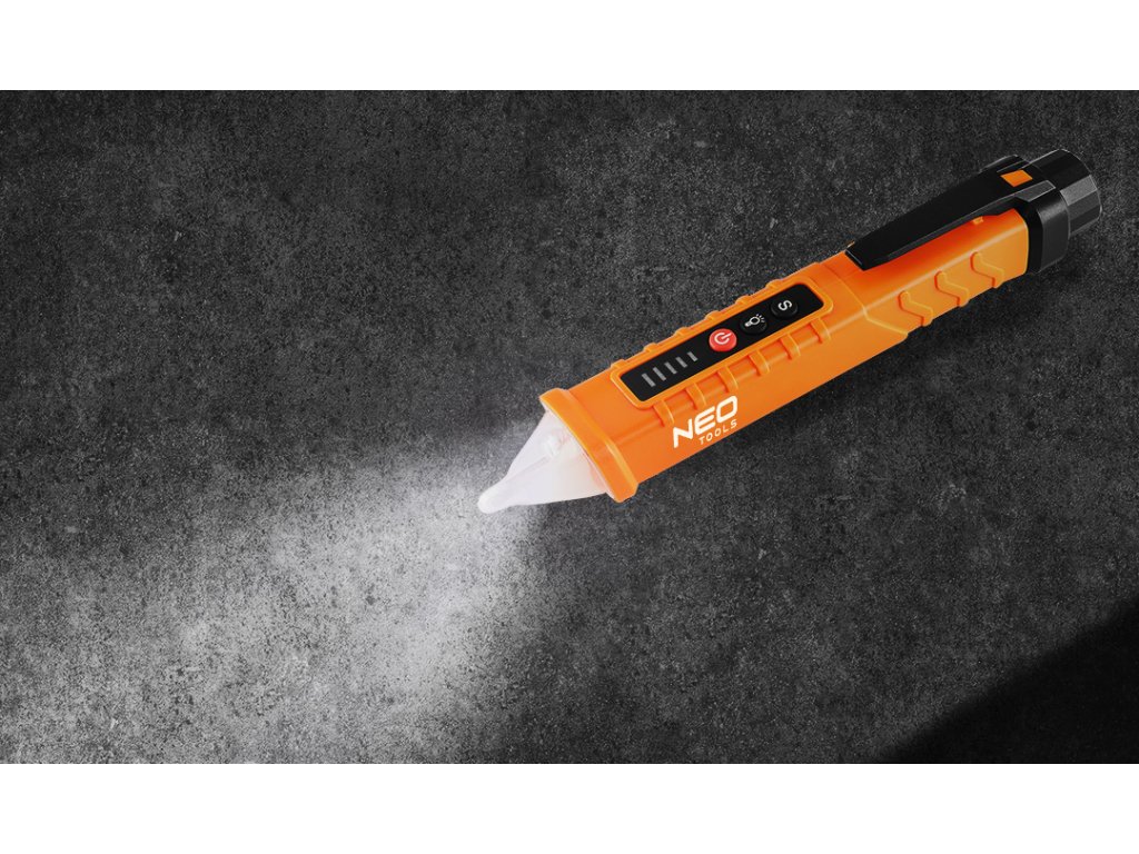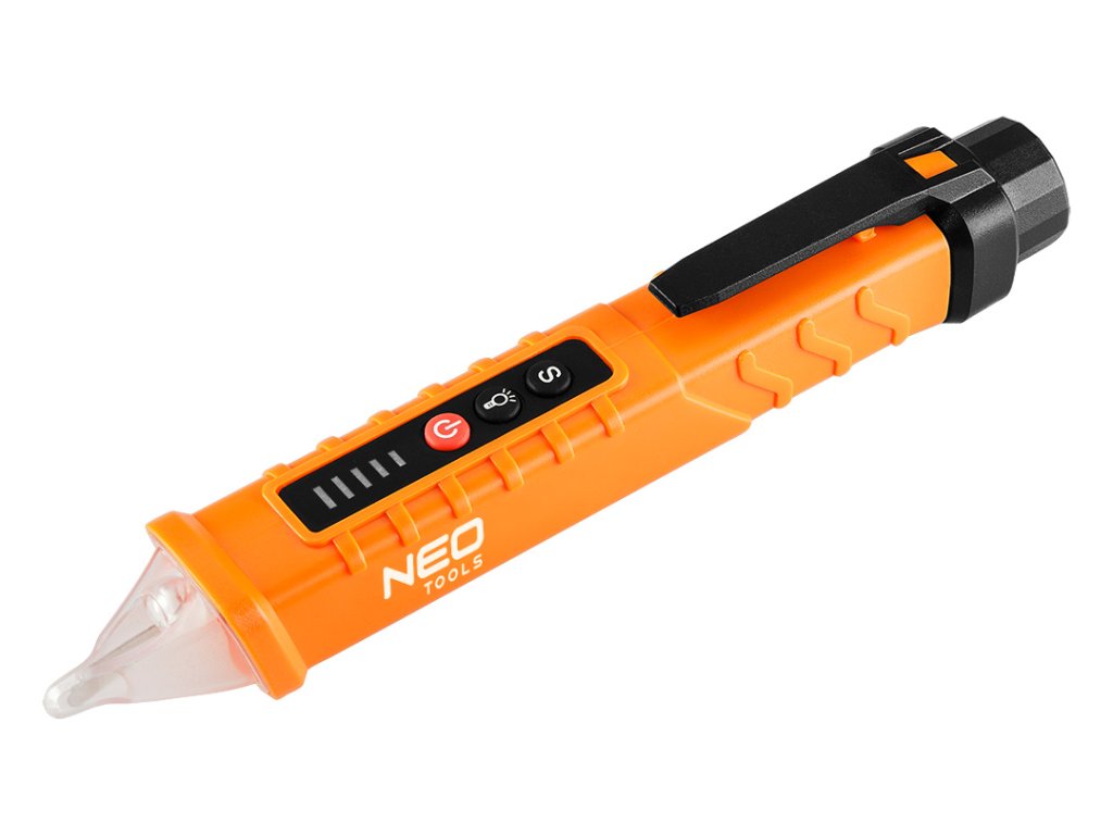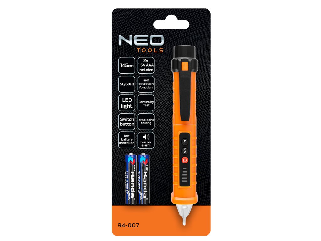 Indukčná skúšačka napätia 12-1000 V AC 94-007 od spoločnosti NEO podporujúca dotykovú (70-250 V AC) a bezdotykovú (70-1000 V AC) metódu. Má celkovú dĺžku 145 mm. Je vybavená asistenčným LED svetlom, zvukovým indikátorom, indikátorom vybitia batérie a praktickým vreckovým klipom. Určený na lokalizáciu porúch v izolovaných striedavých kábloch, kontrolu fázy v zásuvkách striedavého prúdu a lokalizáciu vodičov pod napätím v stene pod omietkou. Skúšačka napätia značky NEO je vybavená napájaním 2x AAA. Frekvencia je 50/60 Hz. Má funkciu testu bodu zlomu a testu kontinuity. Je to nástroj, ktorý dokáže ľahko nájsť poruchu v elektrickej inštalácii.
