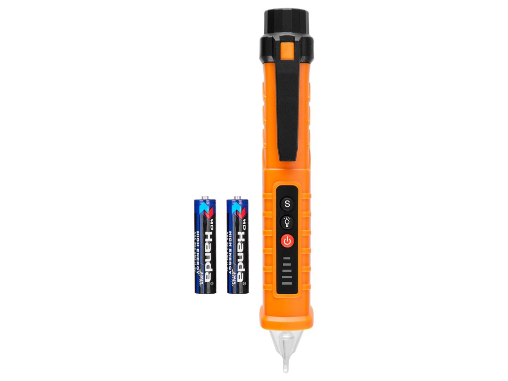 Indukčná skúšačka napätia 12-1000V AC, 50/60Hz, 145mm, napájanie 2xLR44, LED lampa, zvukový indikátor, indikátor slabej batérie, vreckový klip, funkcie: lokalizácia porúch v izolovaných AC kábloch, kontrola fázy v AC elektrických zásuvkách, lokalizácia káblov pod napätím v stene pod omietkou