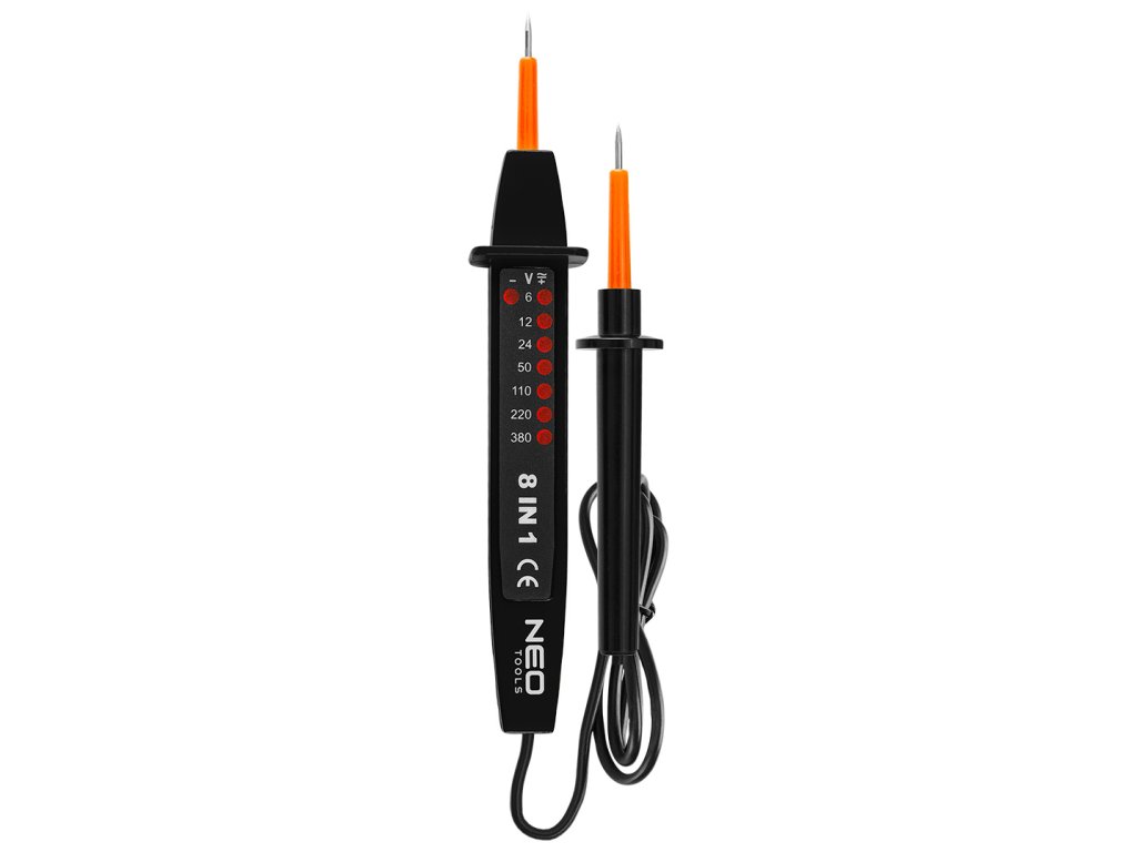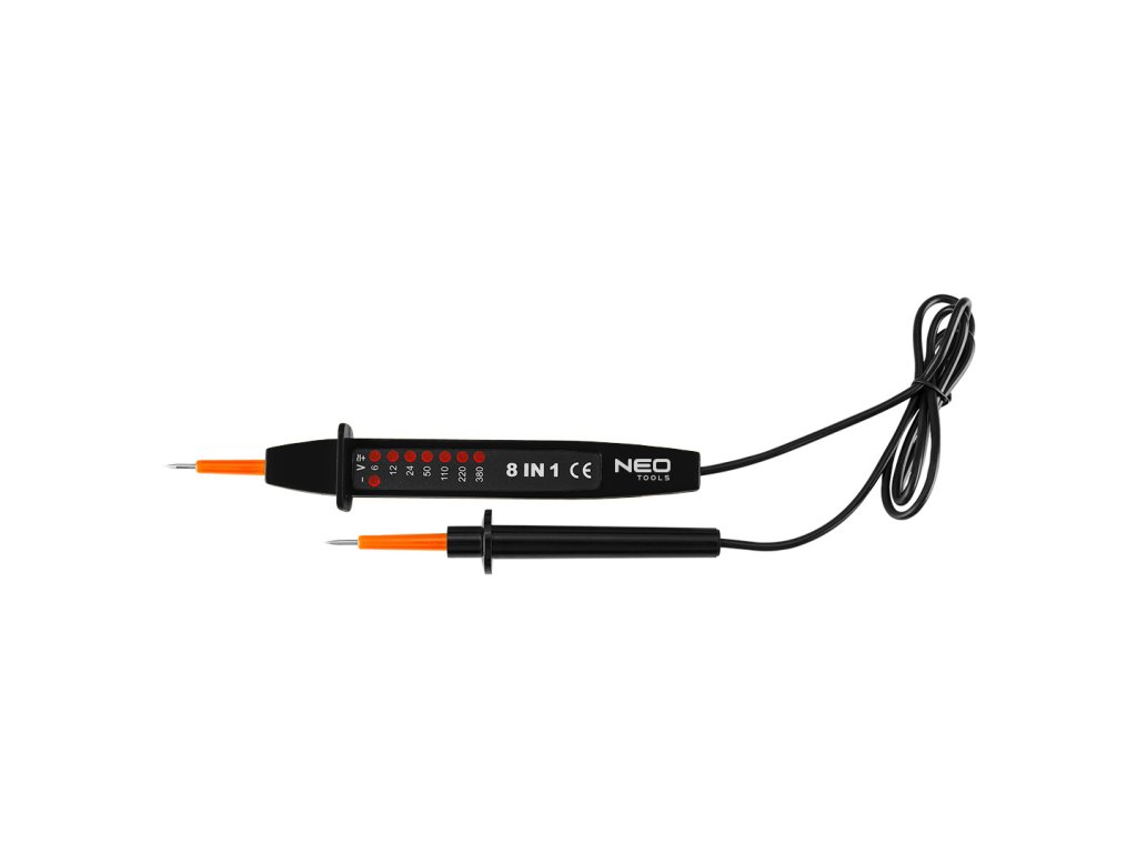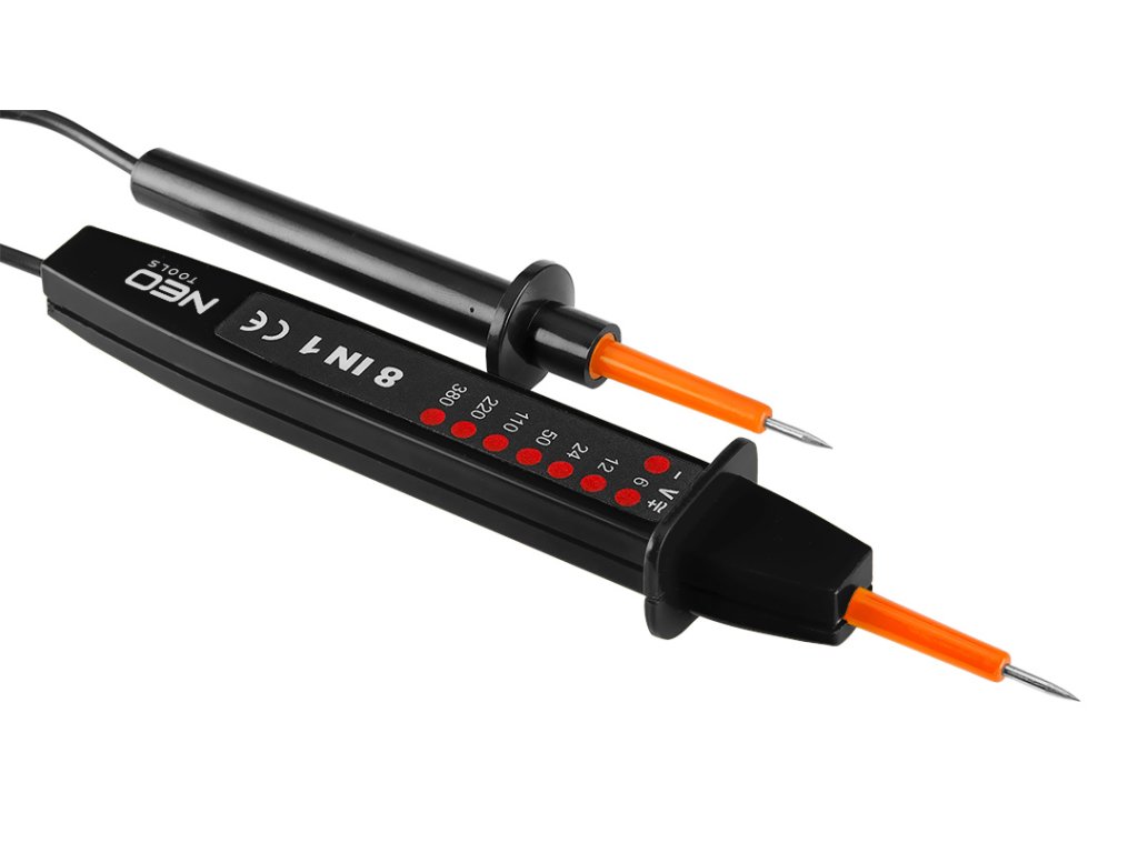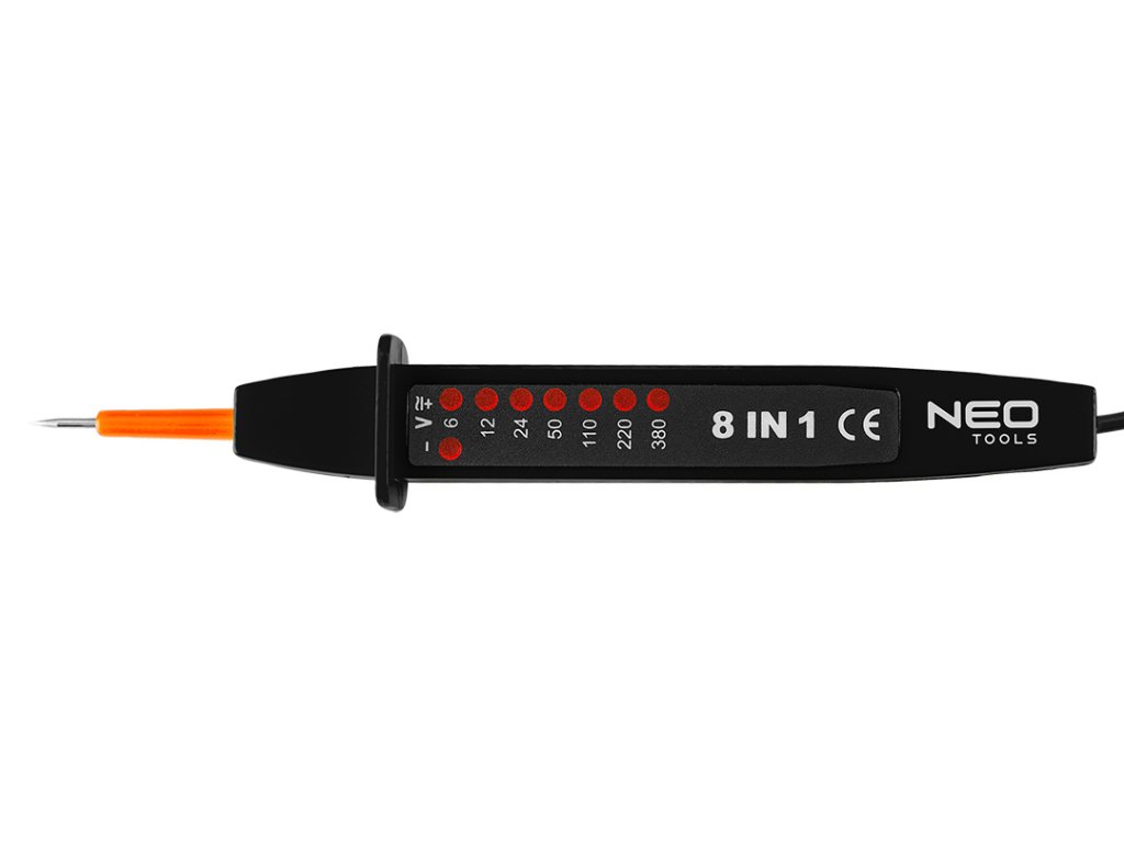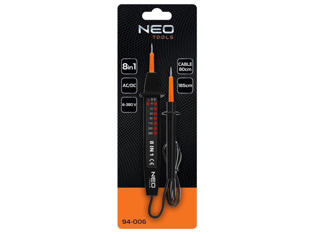 Multifunkčná skúšačka napätia 8 v 1 AC/DC 6-380 V 94-006 od spoločnosti NEO, ktorá podporuje rozsah napätia 6-380 V AC/DC. Má celkovú dĺžku 195 mm. Je vybavená dvoma sondami a 80-centimetrovým káblom. Určená na kontrolu prítomnosti a hodnoty napätia v zásuvkách striedavého a jednosmerného prúdu, kontrolu nuly v elektrickom zväzku v automobiloch a krát v elektrických rozvádzačoch. Skúšačka napätia značky NEO sa vyznačuje tým, že nepotrebuje batériu. Je to nástroj, ktorý ľahko nájde poruchu v elektrickom systéme.