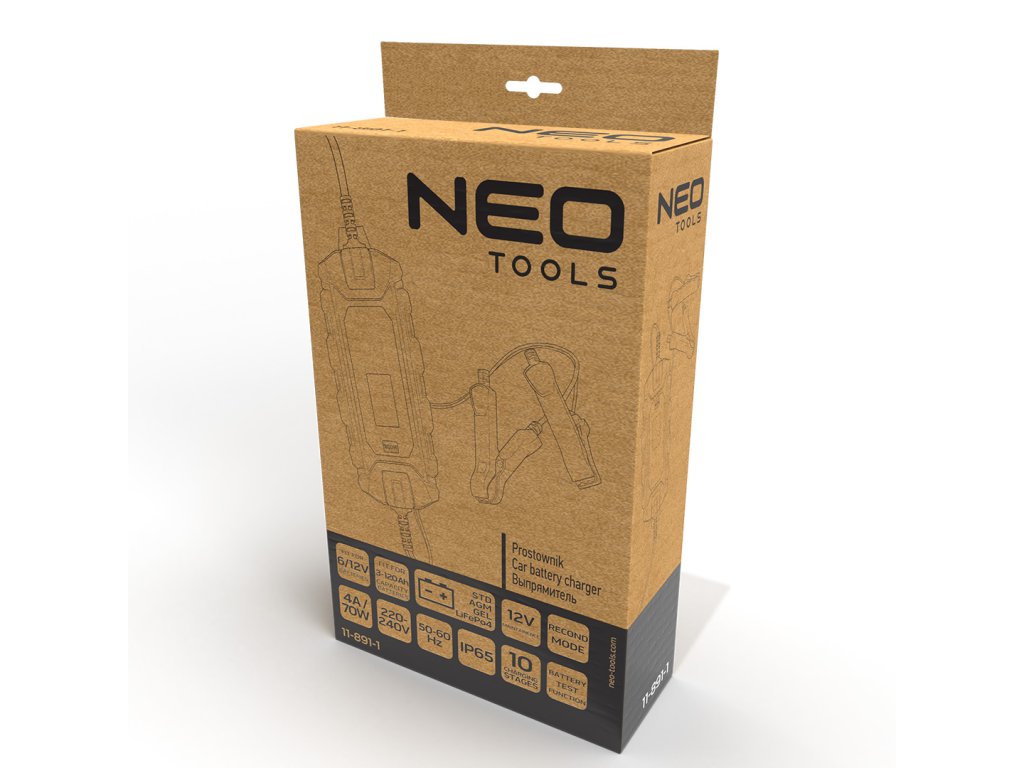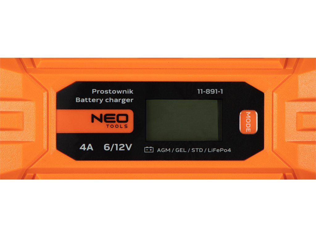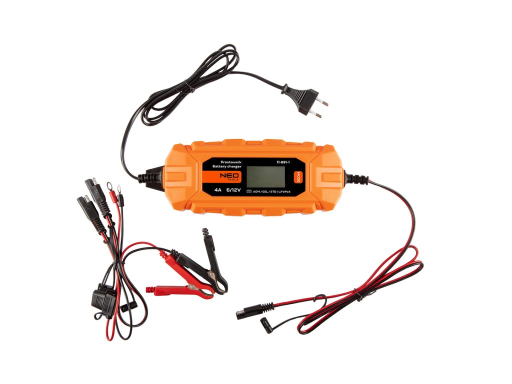 Automatická nabíjačka 4 A/70 W, 3 - 120 Ah, pre kyslé / AGM / GEL batérie 11-891-1 od spoločnosti NEO má schopnosť nabíjať aj hlboko vybité batérie a dokáže ich regenerovať už od 3 V. Odporúča sa aj na ich údržbu v motorových vozidlách a predĺženie ich životnosti. Kompatibilný s batériami STD/AGM/GEL/LiFePO4. Nabíjačka ponúka mikroprocesorové riadenie a zabudovaný LCD displej zobrazujúci údaje o nabíjaní. Samostatné nastavenia režimu nabíjania rozširujú jej možnosti - napríklad možnosť zachovania pamäte a údajov počas výmeny batérie. Okrem iného má zabudované ochrany proti skratu svoriek, spätnému pripojeniu, prehriatiu a prebitiu batérie. Trieda izolácie IP65. Funkcie údržby, regenerácie a testu batérie sú užitočné pre profesionálov, ako aj pre fanúšikov automobilov. Desaťstupňový typ nabíjania plne automatický. Nabíjací prúd je 2A/4A. Napätie podporovaných batérií je 6 V/12 V a výkon 70 W. Napájacie napätie zariadenia je 220-240 V, 50-60 Hz. Dĺžka kábla je 1,5 m. Usmerňovač pracuje s batériou s kapacitou 3-120 Ah. Je ponúkaný s ďalšími káblami na pripojenie k automobilu a návodom.