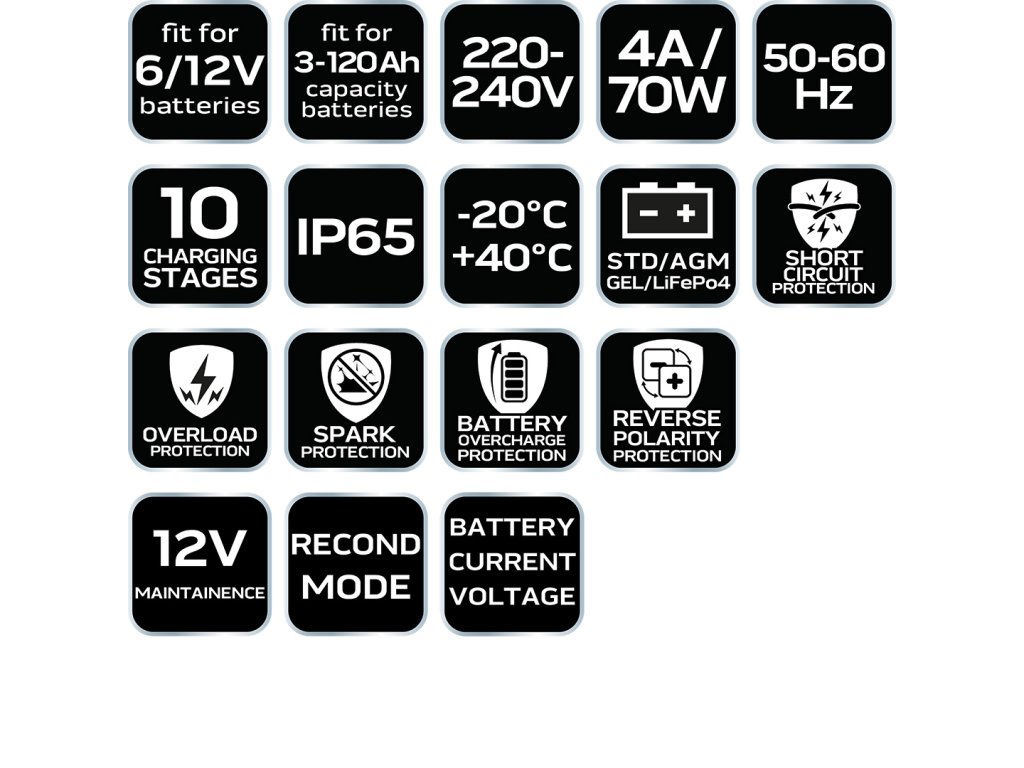 Automatická nabíjačka, pre batérie STD / AGM / GEL / LiFePO4. Dokáže nabíjať hlboko vybité batérie, je schopná regenerovať batériu už od 3 V. Mikroprocesorové riadenie a zabudovaný LCD displej zobrazujúci údaje o nabíjaní. Samostatné nastavenie režimu nabíjania, Zachováva pamäť / údaje počas výmeny batérie, Nabíjací prúd: 2A / 4A, Napätie batérie: Dĺžka kábla: 1,5 m, Kapacita batérie: 10 stupňov, Plne automatické nabíjanie: 3-120Ah, trieda izolácie: 1: Vstavaná ochrana: skrat svoriek, spätné pripojenie, prehriatie, prebitie batérie, funkcie: údržba, regenerácia, test batérie.