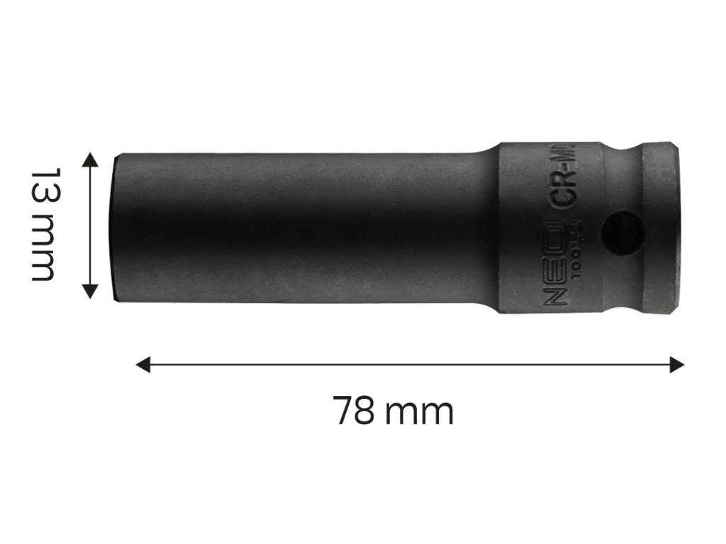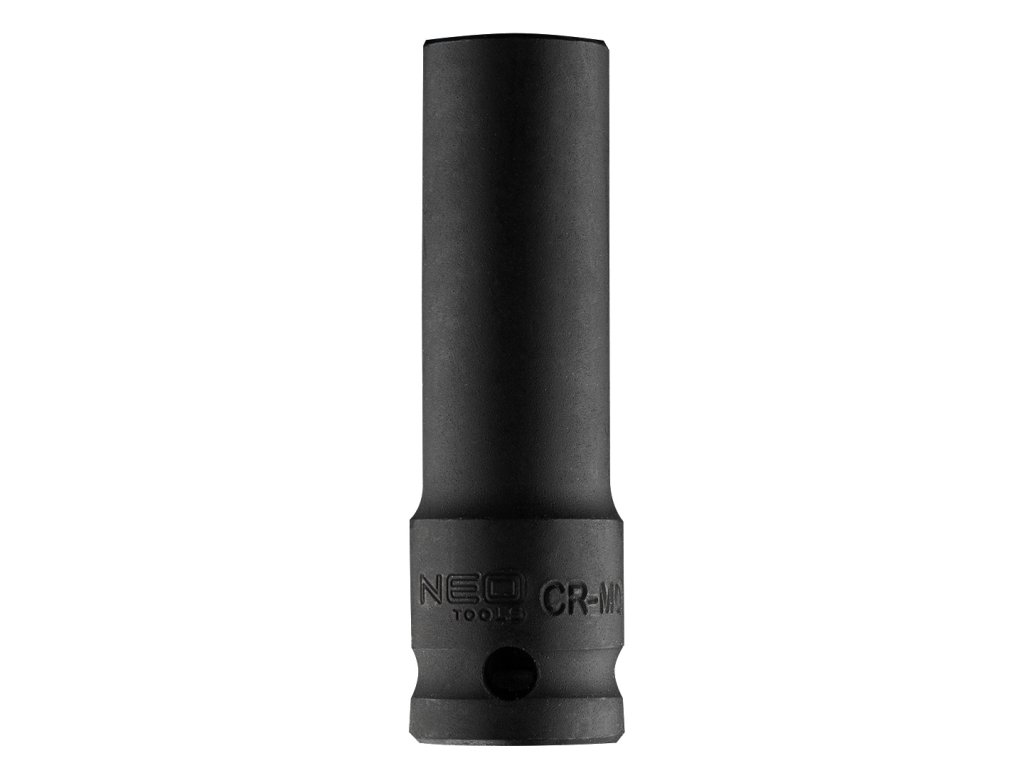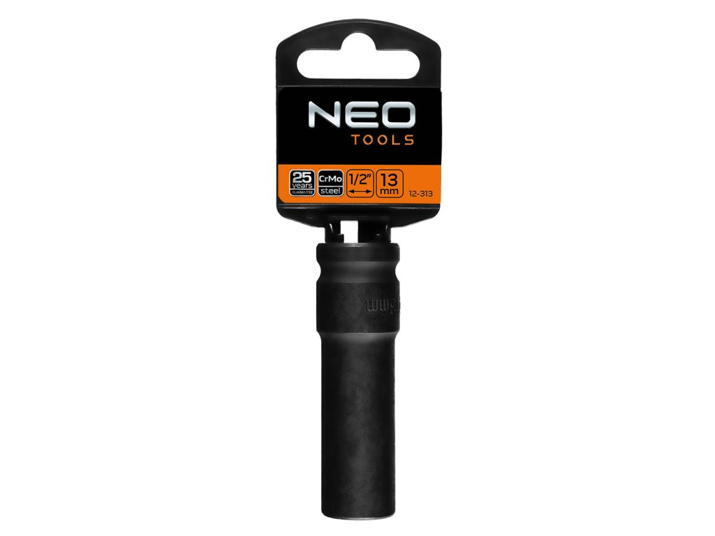 Rázová hlavica 13 mm dlhá, 1/2" NEO (ref. 12-313). Vyrobené z odolnej chróm-molybdénovej ocele. Zhrubnuté steny zásuvky zaručujú jej vysokú odolnosť. Väčšia dĺžka zásuvky umožňuje prístup k hlbokým skrutkovým zásuvkám. Značka NEO spĺňa očakávania profesionálov.