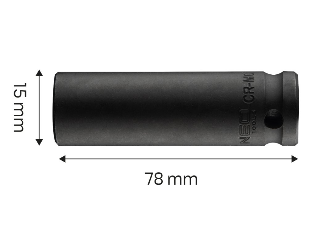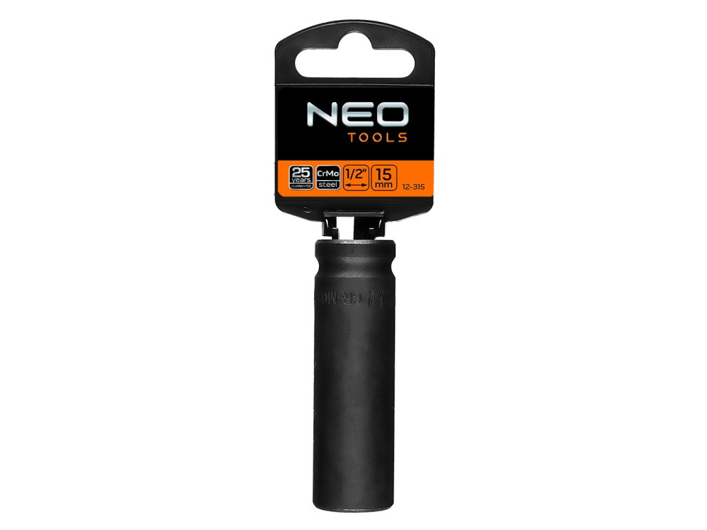 Rázová hlavica 15 mm dlhá, 1/2" NEO (ref. 12-315). Vyrobené z odolnej chróm-molybdénovej ocele. Zhrubnuté steny zásuvky zaručujú jej vysokú odolnosť. Väčšia dĺžka zásuvky umožňuje prístup k hlbokým skrutkovým zásuvkám. Značka NEO spĺňa očakávania profesionálov.