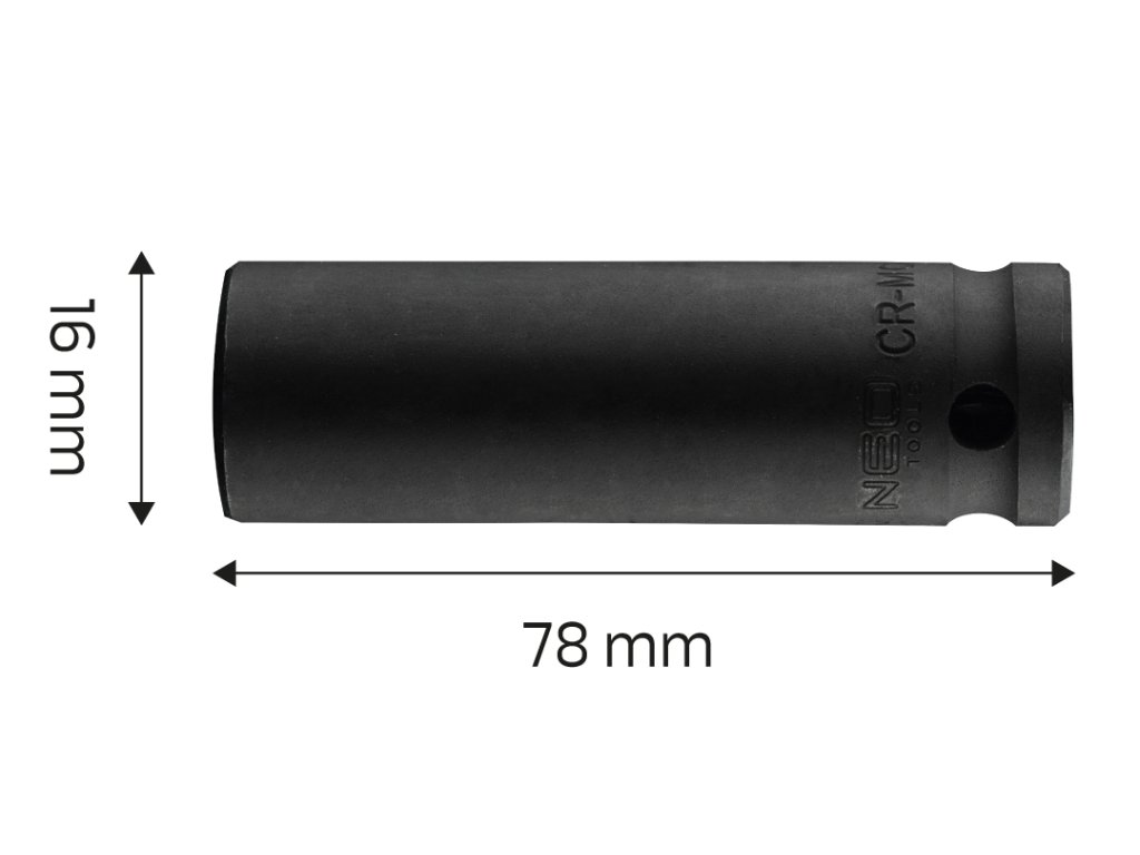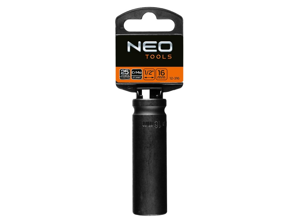 Rázová hlavica 16 mm dlhá, 1/2" NEO (ref. 12-316). Vyrobené z odolnej chróm-molybdénovej ocele. Zhrubnuté steny zásuvky zaručujú jej vysokú odolnosť. Väčšia dĺžka zásuvky umožňuje prístup k hlbokým skrutkovým zásuvkám. Značka NEO spĺňa očakávania profesionálov.