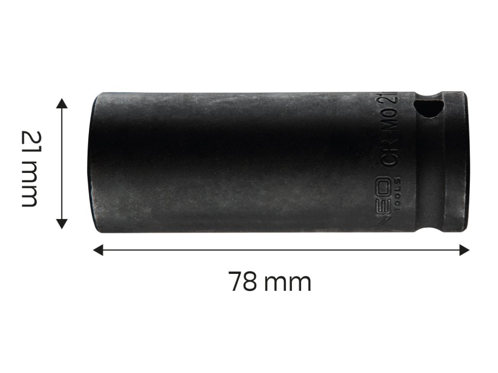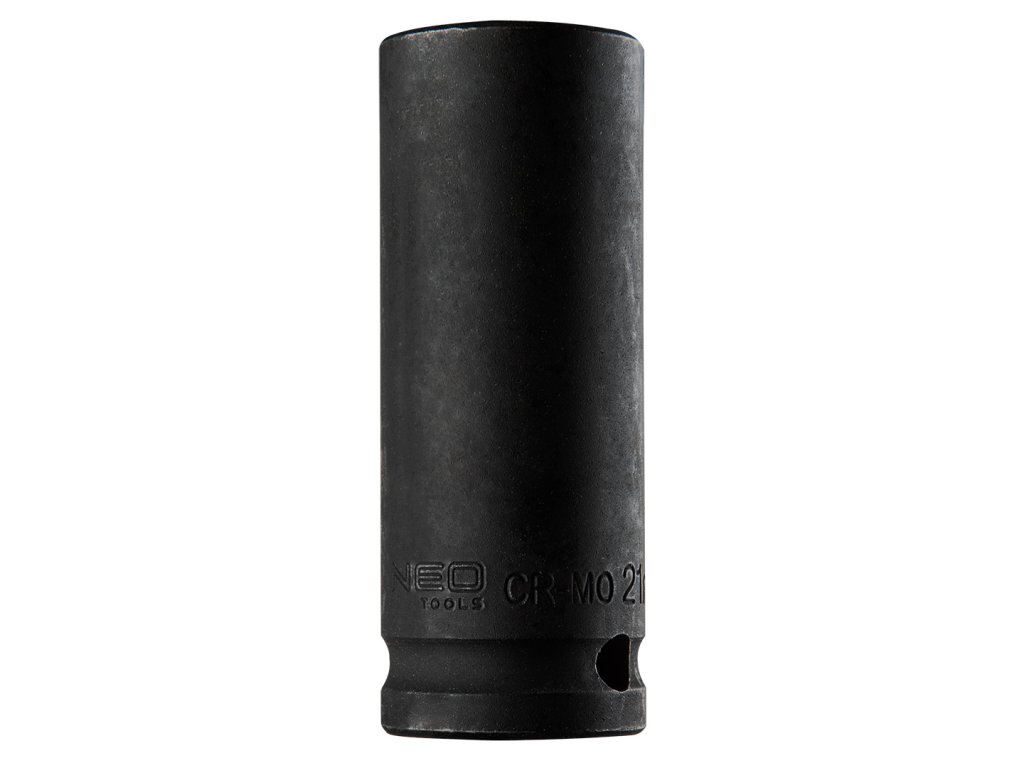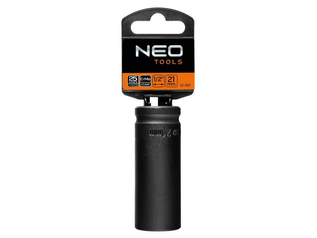 Rázová hlavica 21 mm dlhá, 1/2" NEO (ref. 12-321). Vyrobené z odolnej chróm-molybdénovej ocele. Zhrubnuté steny zásuvky zaručujú jej vysokú odolnosť. Väčšia dĺžka zásuvky umožňuje prístup k hlbokým skrutkovým zásuvkám. Značka NEO spĺňa očakávania profesionálov.