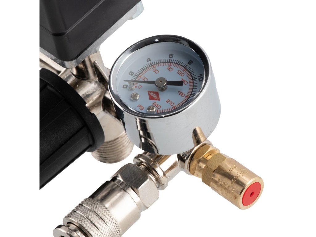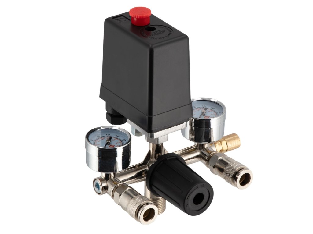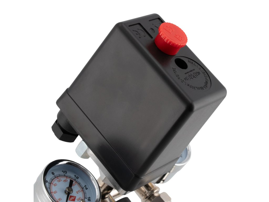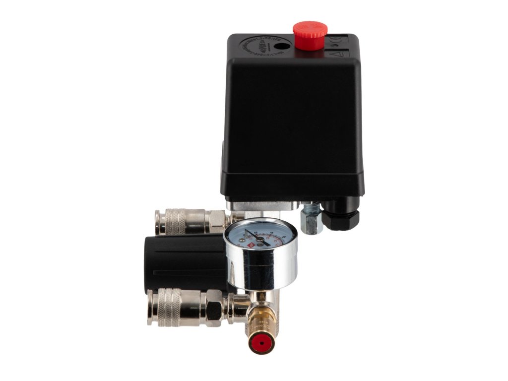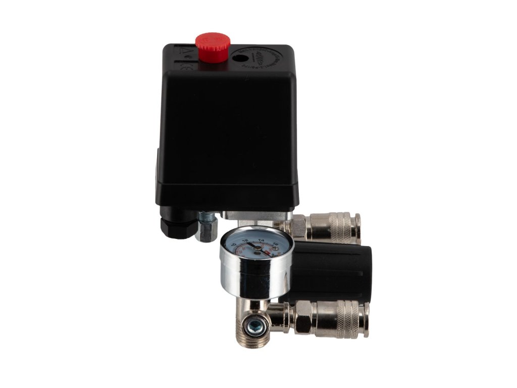 Do kompresorov usadených na nádržiach 6 - 90L Sada obsahuje: - Reduktor - Tlakový spínač - Bezpečnostný ventil - Rýchlospojka 2 ks - Manometer 2 ks