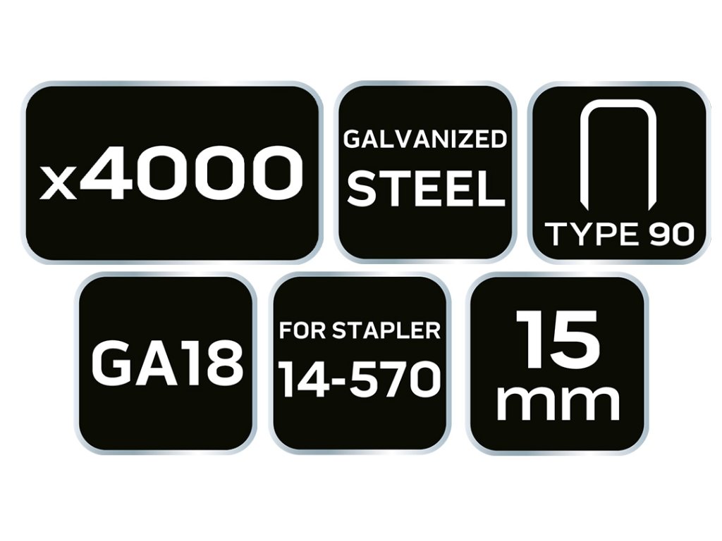 Pozinkované sponky pre pneumatické sponkovačky, GA18, typ 90 (4K), dĺžka 15 mm, 4000 ks.