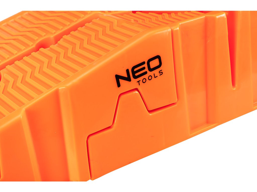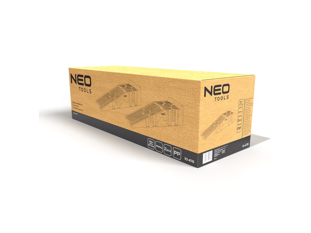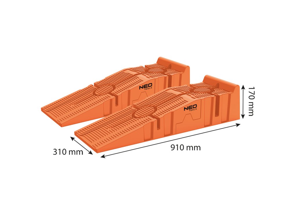 Nájazdové rampy 2 ks, kompozitná, 3000 kg pár 10-478 od spoločnosti NEO je sada dvoch kusov praktických opierok nôh do auta vyrobených z odolného polypropylénu. Nájazdy sa vyznačujú dĺžkou 910 mm, šírkou 310 mm a výškou 170 mm. Nosnosť jedného páru je 3 000 kg. Tieto prenosné nájazdy na vozidlá sa používajú na zdvihnutie prednej časti vozidla. Uľahčujú prístup k vozidlám a manipuláciu s nimi a umožňujú efektívnejšie vykonávanie operácií. Automobilová rampa značky NEO je vhodná pre domácich majstrov aj profesionálnych používateľov. Je to vynikajúca mobilná alternatíva k automobilovým výťahom alebo kanálom.