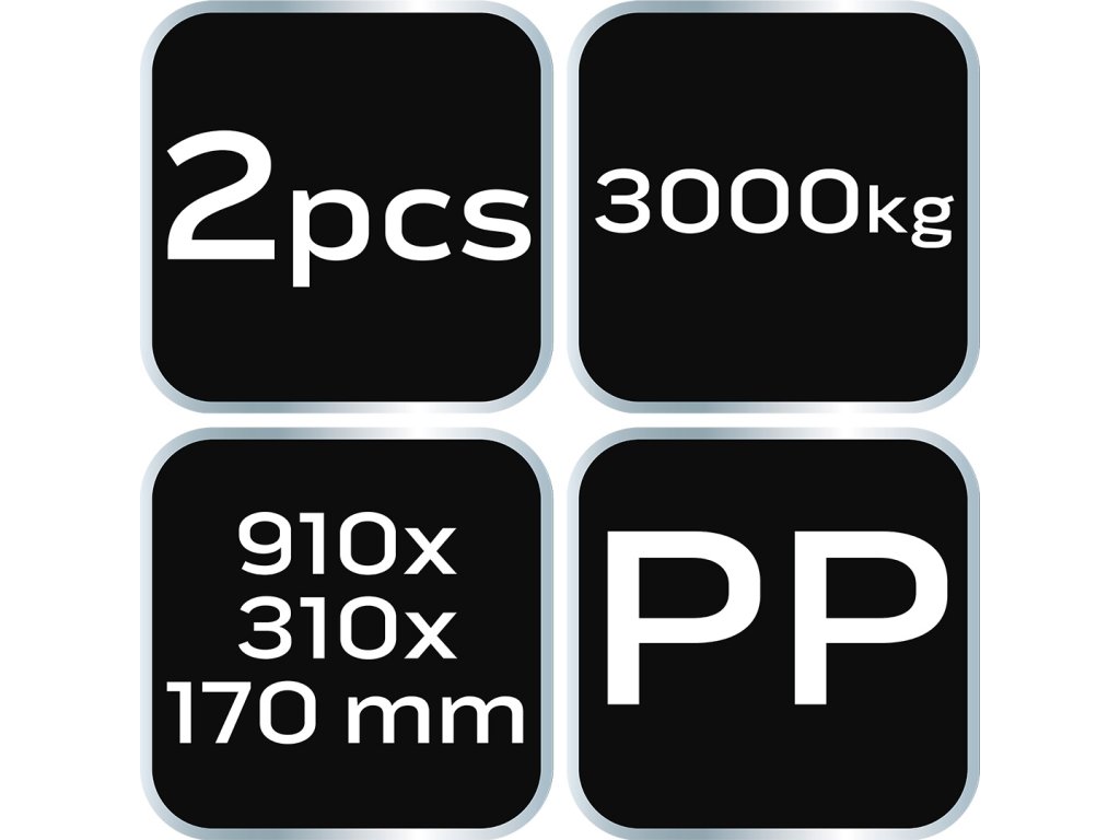 Nájazdové rampy 2 ks, rozmery: D 910 x Š 310 x V 170 mm, 2 ks, nosnosť: 3000 kg na pár, vyrobené z polypropylénu.
