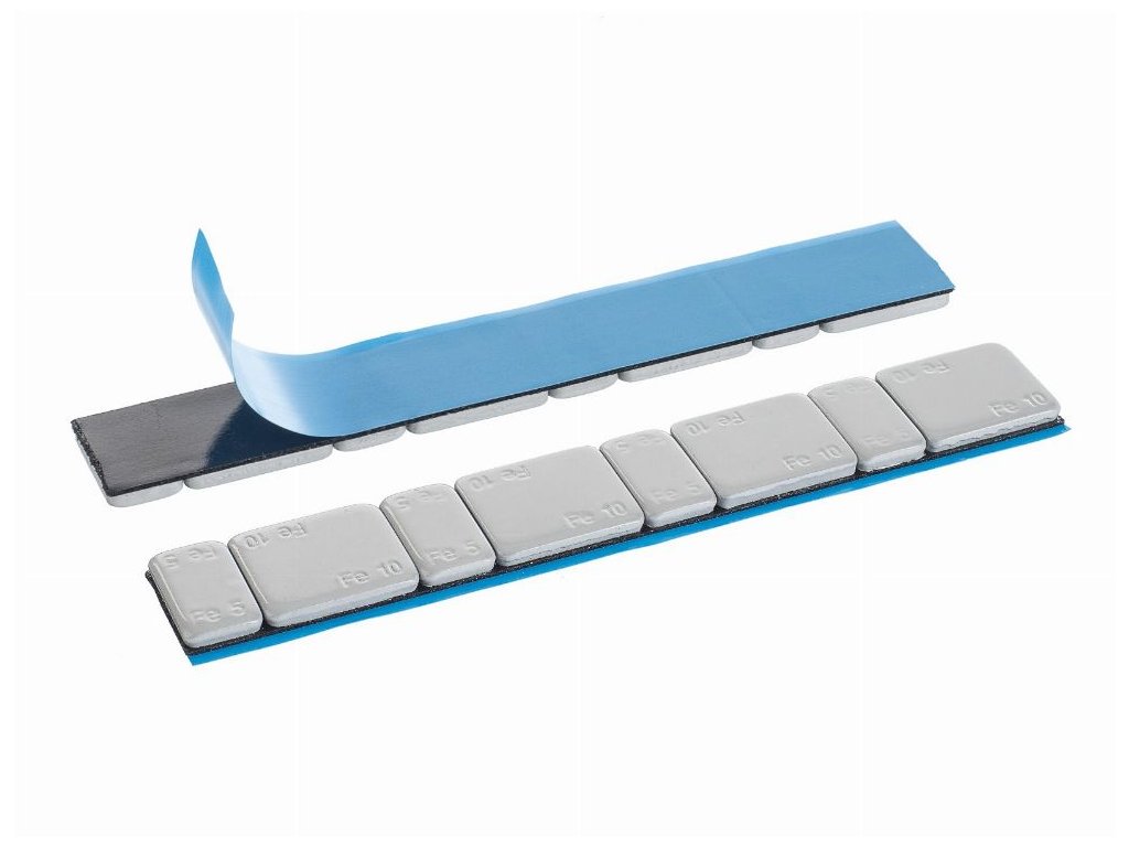 SLIM 60g (4 x 5g + 4 x 10 g) oceľové priľnavé závažie, pozinkované, sivo lakované, so širokou modrou páskou. Ideálne riešenie, ktoré zaručuje presné vyváženie zliatinových diskov osobných automobilov.