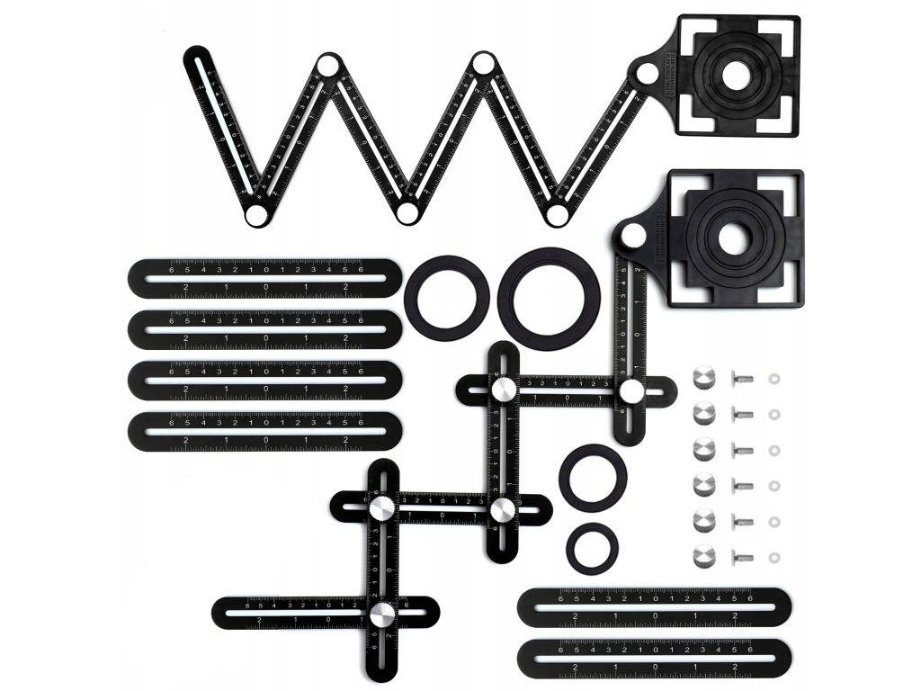 Až 12 dielov: V sade 6-ramenná merka + meradlo otvorov 25 mm, 40 mm, 45 mm, 55 mm, 75 mm!