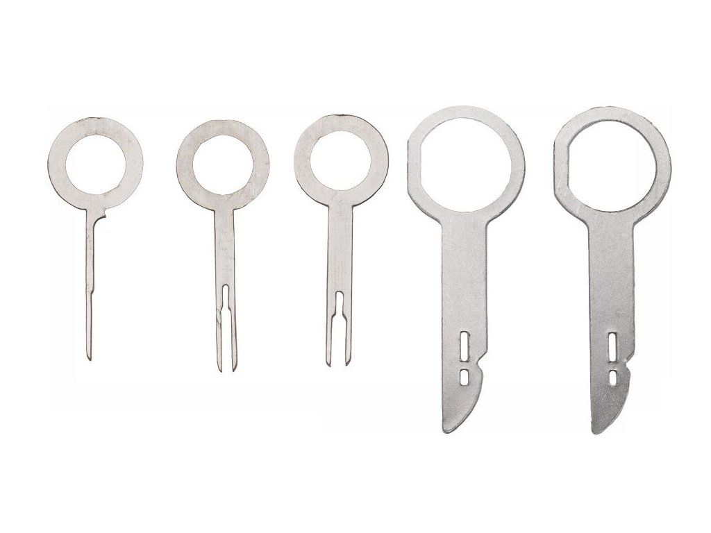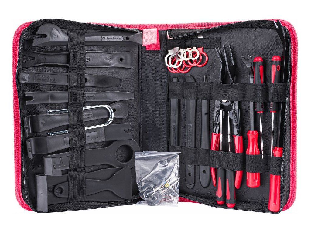 Súprava obsahuje rôzne typy sťahovákov a páčidiel na čalúnenie, klipy, panely a autorádiá vrátane hákov (45°, 90°, 135°), špachtlí, pák a sady vyťahovačov autorádií (22 ks).