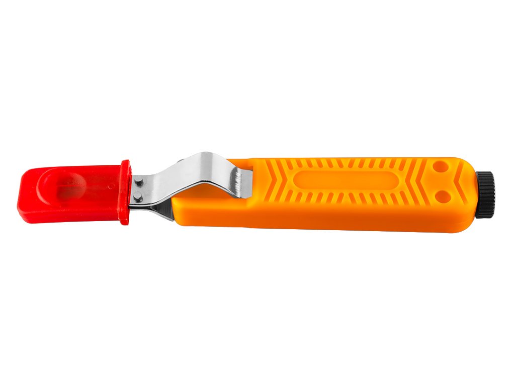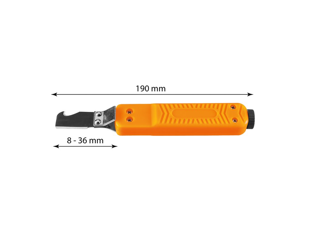 Odstraňovač izolácie káblov s háčikom na káble v rozsahu 8-38 mm, dĺžka 190 mm, materiál tela plast, výsuvná svorka na káble, hmotnosť 100 g, ochranný kryt čepele, hĺbka rezu nastaviteľná pomocou nastavovacej skrutky