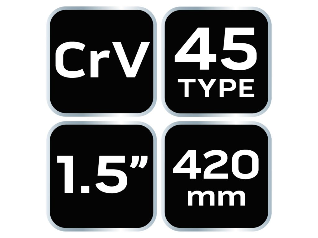Kľúč na rúry typ "45°", dĺžka 420 mm, šírka čeľustí 1,5", chróm-vanádiová oceľ, kované a brúsené čeľuste, nastaviteľná skrutka, šnekový prevod, čeľuste so zubami