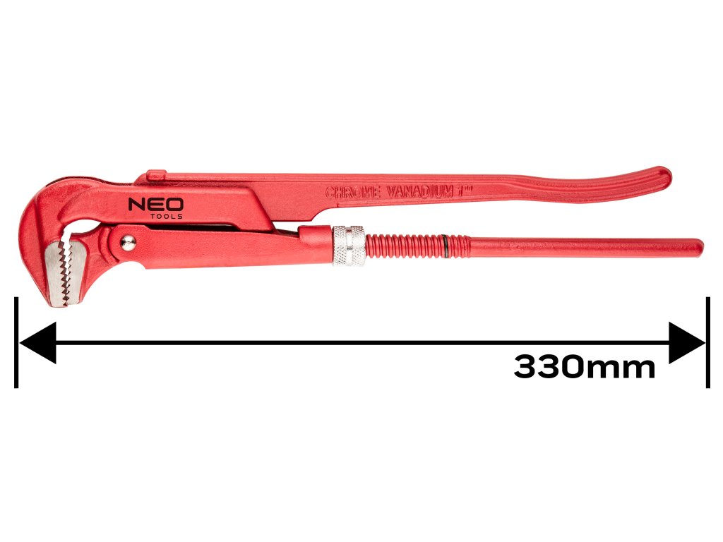 NEO kľúč na rúry typu "90" (ref. 02-423) s dĺžkou 330 mm. Určené na odskrutkovanie a utiahnutie potrubia a ventilov. Vďaka drážkovanej vnútornej strane čeľustí je uchopenie okrúhleho profilu pevné. Vyrobené z odolnej chróm-vanádiovej ocele, ktorá zaručuje dlhú životnosť nástroja. Značka NEO spĺňa očakávania profesionálov.