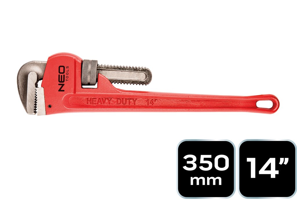 NEO stillsonov kľúč na rúry (ref. 02-417) s dĺžkou 350 mm a rozsahom do 14". Určené na odskrutkovanie a utiahnutie potrubia a ventilov. Vďaka drážkovanej vnútornej strane čeľustí je uchopenie okrúhleho profilu pevné. Odolné kalené čeľuste so širokým prierezom umožňujú zvýšiť krútiaci moment. Značka NEO spĺňa očakávania profesionálov.