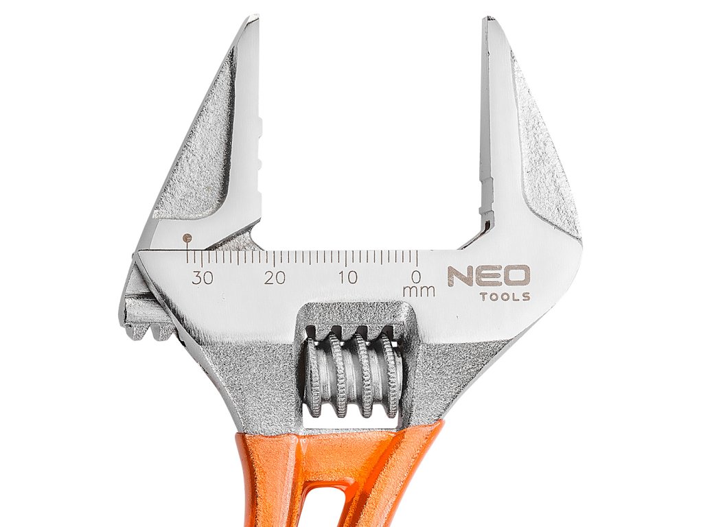 Nastaviteľný kľúč NEO s dĺžkou 139 mm a rozsahom 0-32 mm je kovaný z odolnej chróm-vanádiovej ocele. Vyznačuje sa predĺženými profilovanými čeľusťami s veľmi širokým rozsahom nastavenia a malou hrúbkou hlavy kľúča, ktorá uľahčuje prácu na ťažko prístupných miestach. Skrátená rukoväť pri zachovaní širokého rozsahu rozstupu čeľustí umožňuje prácu s kľúčom v stiesnených priestoroch. Kľúč má systém ochrany skrutkovaných prvkov - sila nesmeruje priamo na okraj skrutky alebo matice. Vďaka špeciálnej konštrukcii rukoväte je kľúč až o 30 % ľahší ako štandardný nastaviteľný kľúč. Rukoväť s protišmykovým povrchom zaručuje bezpečné uchopenie a bezpečnú prácu. Kvalitu nástroja potvrdzuje 25-ročná záruka. Značka NEO spĺňa očakávania profesionálov.
