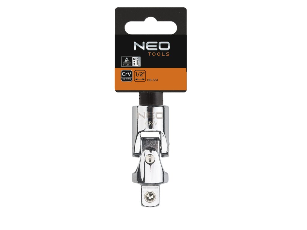 Univerzálny kĺb NEO 1/2" (ref. 08-551) vyrobený z odolnej chróm-vanádiovej ocele podľa normy DIN 3123. Vysokú kvalitu a spoľahlivosť výrobku zaručuje certifikát TÜV Rheinland. Značka NEO spĺňa očakávania profesionálov.