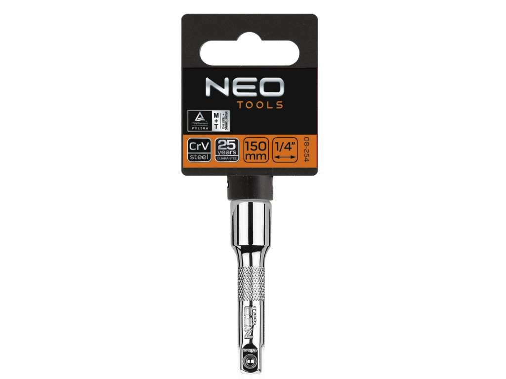 NEO 1/4" predĺženie (ref. 08-251) s dĺžkou 50 mm. Vyrobené z odolnej chróm-vanádiovej ocele podľa normy DIN 3123. Kvalita nástroja potvrdená certifikátom TÜV a 25-ročnou zárukou výrobcu. Značka NEO spĺňa očakávania profesionálov.