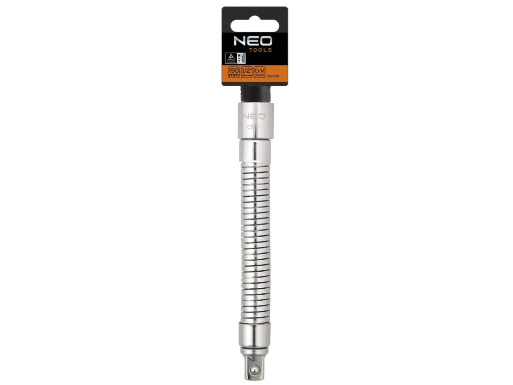 NEO flexibilná 1/2" predlžovacia rúrka (ref. 08-558) s dĺžkou 190 mm. Vyrobené z odolnej chróm-vanádiovej ocele. Umožňuje prácu na ťažko prístupných miestach. Certifikát TÜV Rheinland je zárukou vysokej kvality a spoľahlivosti výrobku. Značka NEO spĺňa očakávania profesionálov.