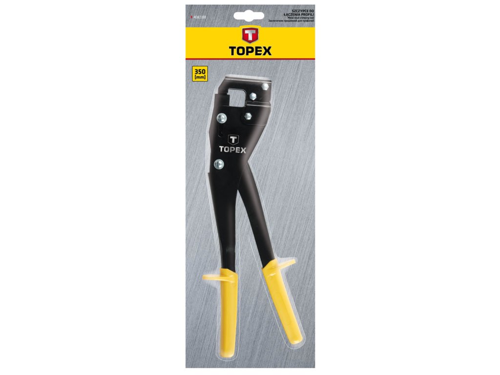 Kliešte na profilové spoje TOPEX (ref. 43E100), dĺžka 350 mm. Lisovaním plechu vytvárajú odolné a stabilné spojenie profilov, ktoré tvoria konštrukciu na stavbu deliacich stien a podhľadov zo sadrokartónových dosiek. Použitím klieští ušetríte na skrutkách. Pogumované protišmykové rukoväte zvyšujú pohodlie pri práci. Značka TOPEX je určená pre domácich majstrov.