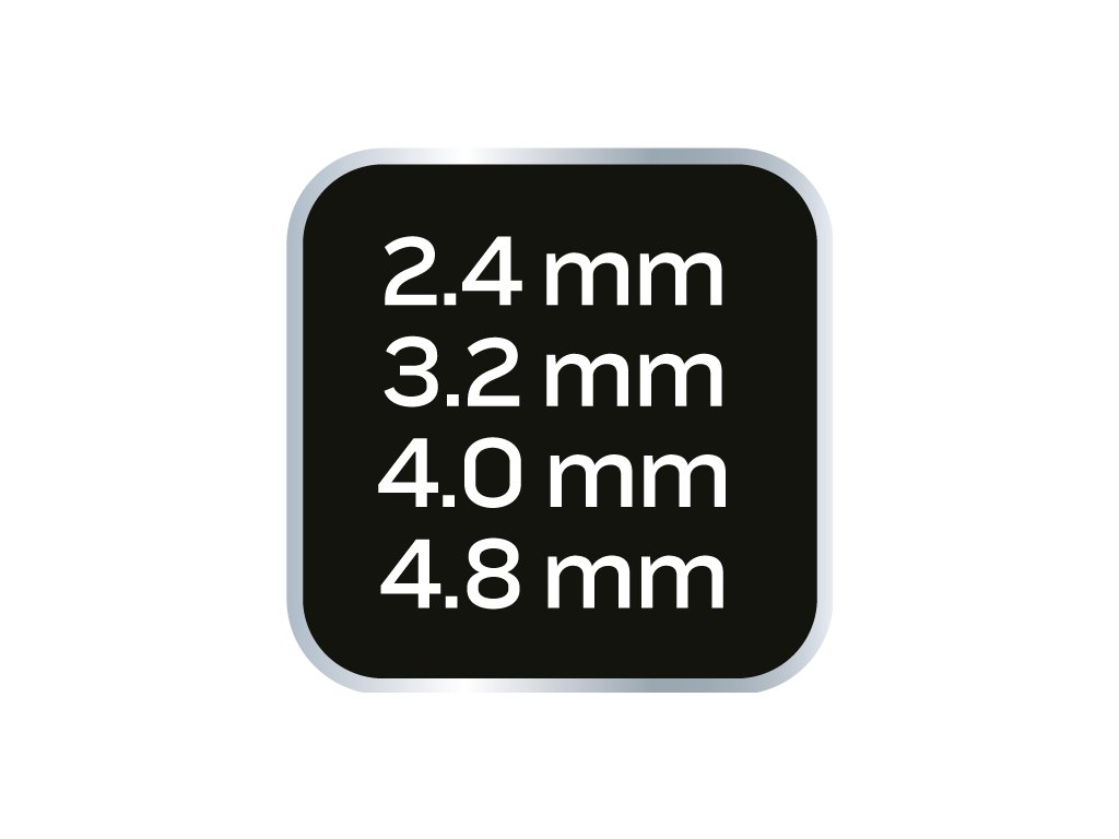 Zápustný nitovač pre oceľ a hliník 2.4, 3,2, 4,0, 4,8 mm, 4 nástavce, 3-čeľusťové skľučovadlo, mechanizmus rýchlej výmeny čeľustí, O2,4 mm: hliník, oceľ, meď, nehrdzavejúca oceľ, O3,2 mm: hliník, oceľ, meď, nehrdzavejúca oceľ, O4,0 mm: hliník, oceľ, meď, nehrdzavejúca oceľ, O4.8 mm: hliník, oceľ, meď