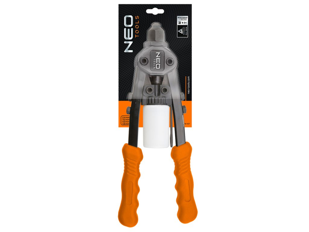 NEO nitovacia hlava (ref. 18-107) na oceľové, nerezové, hliníkové a medené nity. Na profesionálne použitie v stavebníctve a priemysle. Nitovač odstraňuje nity z tvrdých materiálov, ako je oceľ a nehrdzavejúca oceľ. Trojčeľusťová rukoväť poskytuje silnejšie uchopenie nitu a odstraňuje zlomené konce. Krátke ramená a malé rozmery umožňujú prácu na ťažko prístupných miestach. Má záchytnú misku na zlomené nity. Certifikát TÜV Rheinland je zárukou vysokej kvality a spoľahlivosti výrobku. Značka NEO spĺňa očakávania profesionálov.