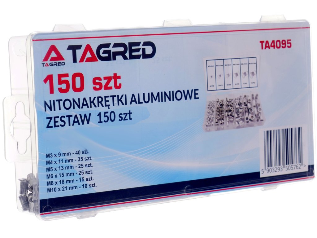 Hliníkové nýtované matice veľkosti M3 až M10. Majú valcovú, vroubkovanú prírubu, vďaka čomu lepšie priľnú k upevňovanému prvku. Nitovacie matice TAGRED umožňujú zaskrutkovanie skrutky alebo svorníka s metrickým závitom do plechu alebo iných materiálov, kde nie je možné vyrobiť závit.
