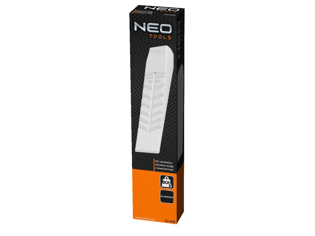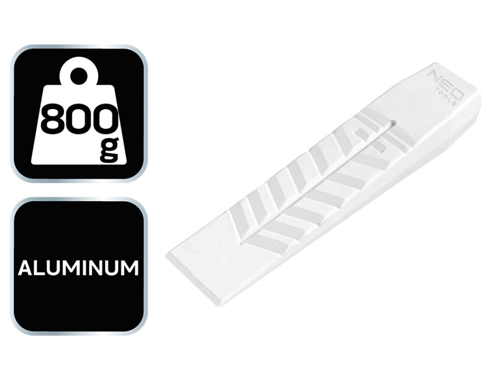 Hliníkový klin 27-212 od spoločnosti NEO s hmotnosťou 800 g je určený na štiepanie dreva. Má hmotnosť 800 g. Trvácny, odolný proti deformáciám, vyrobený z hliníka, je určený na dlhoročné používanie. Zodpovedajúci profilovaný povrch zabraňuje spätnému posunu dreva. Klin značky NEO je určený na dlhoročné používanie a osvedčí sa v každej domácnosti, na pozemku, v záhrade aj pri lesných prácach.