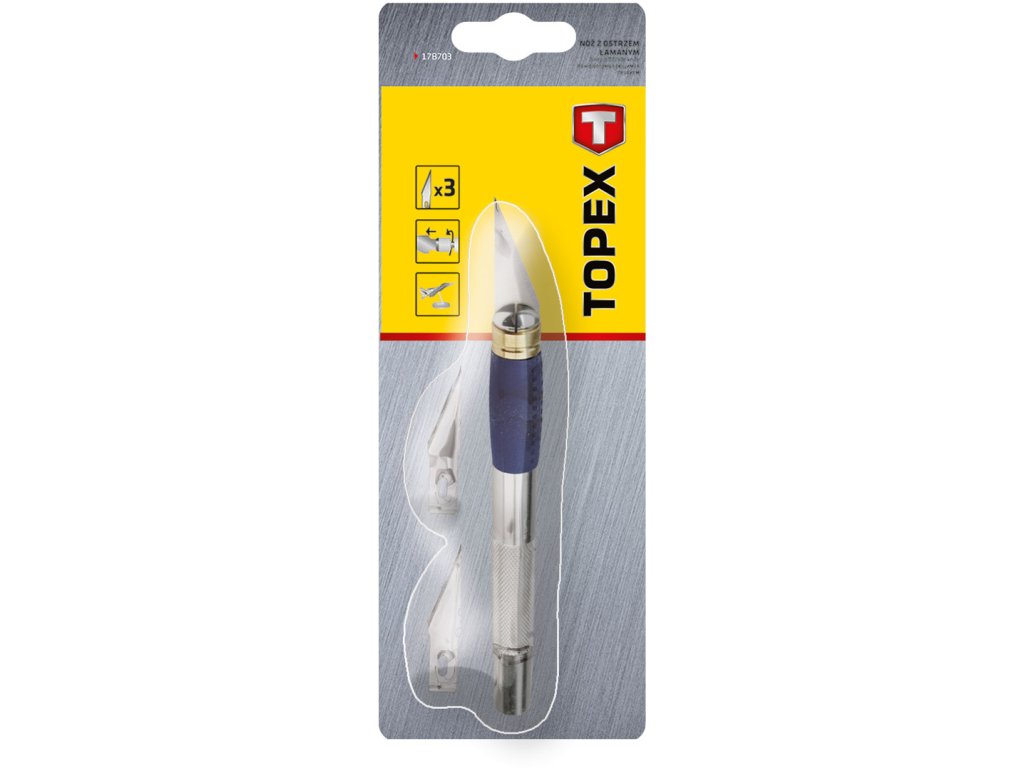 Modelársky nôž TOPEX (ref. 17B703) určený na presné rezy. Telo z kovu s vrúbkovanou rukoväťou. Gumový golier na čepeli umožňuje bezpečné uchopenie a zvyšuje pohodlie pri práci. Súprava obsahuje 3 čepele. Značka TOPEX je určená pre domácich majstrov.