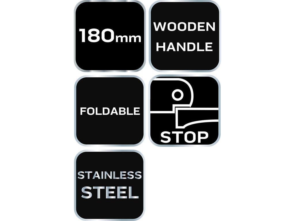 Montážny nôž, drevené kryty, skladacie telo, celková dĺžka otvoreného noža 180 mm, celková dĺžka zatvoreného noža 100 mm, dĺžka čepele 80 mm, čepeľ z nehrdzavejúcej ocele, odlamovacia čepeľ, oceľové nity, čepeľ s priestorom na ľahké otváranie, rukoväť s drevenými krytmi, druh dreva - jelša, certifikát FSC.