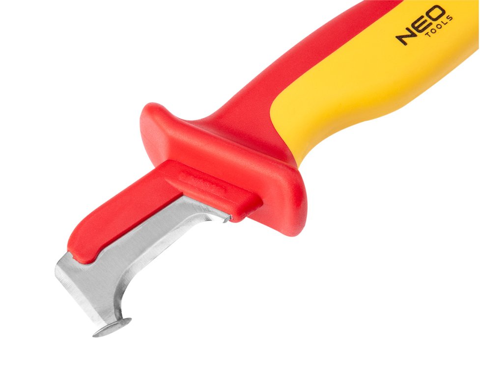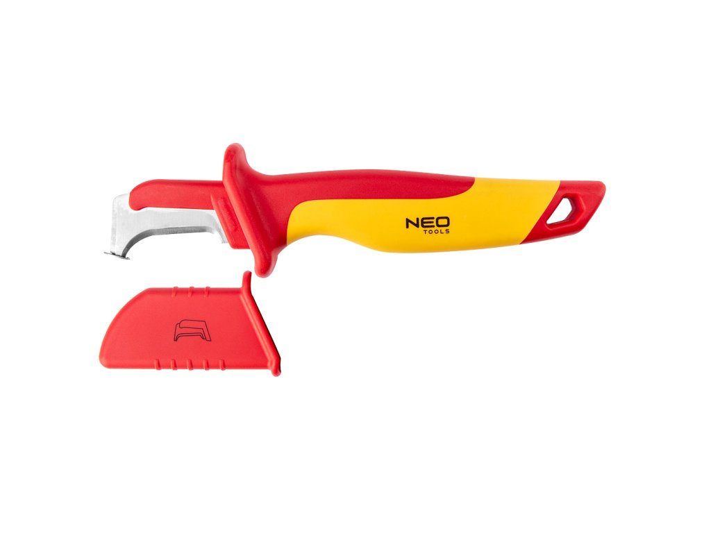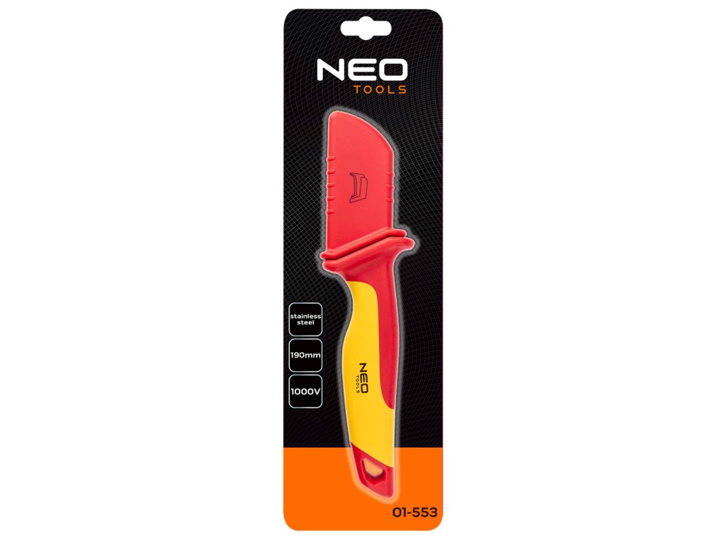Montážny nôž 1000 V, 180 mm 01-553 od NEO TOOLS je izolovaný nástroj určený na prácu s napätím do 1000 V. Vyznačuje sa celkovou dĺžkou 180 mm a tvrdosťou čepele 51-53 HRc. Je vybavený dvojzložkovou rukoväťou a ochranným krytom čepele, čo prispieva k jeho pohodlnému používaniu. Nôž NEO TOOLS je vyrobený z odolnej CrV ocele, vďaka ktorej bude užitočný po mnoho sezón. Vďaka doštičke umožňuje zatlačiť a držať nôž za izoláciu, čo uľahčuje jej rezanie. Odporúča sa pre elektrikárov.