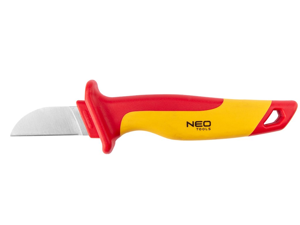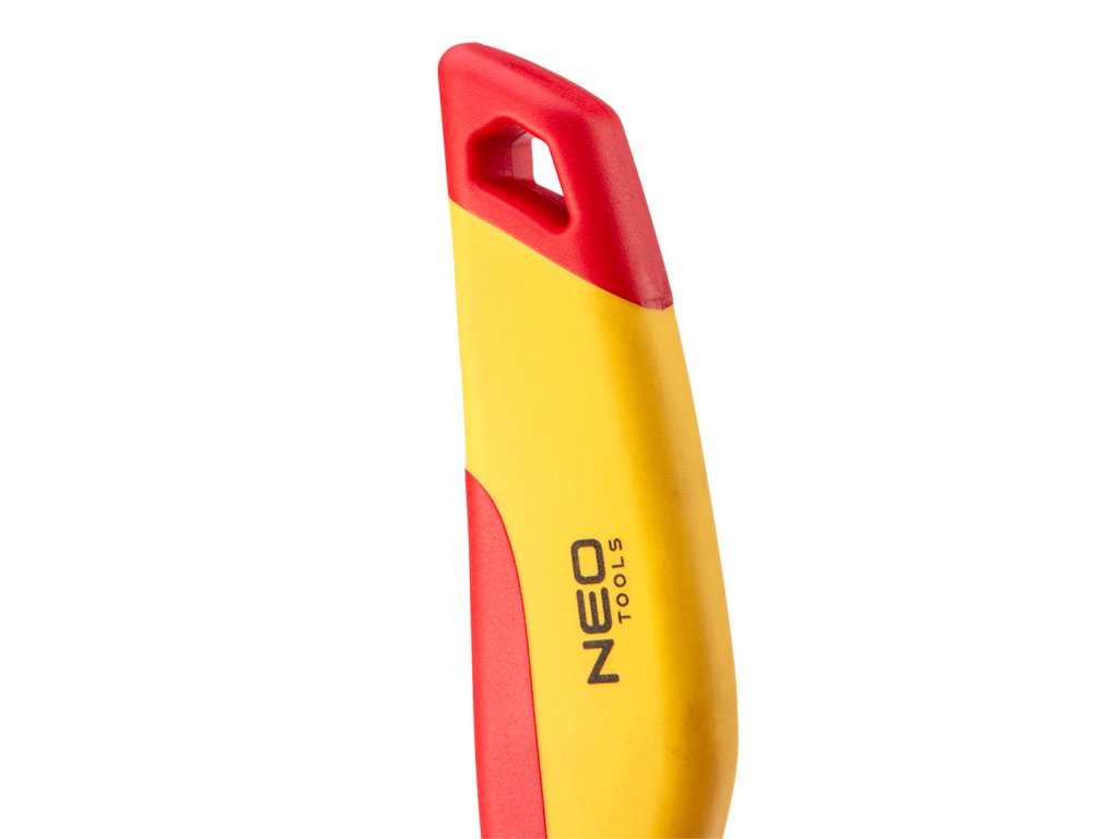 Montážny nôž 1000 V, 190 mm 01-552 od NEO TOOLS je izolovaný nástroj určený na prácu s napätím do 1000 V. Vyznačuje sa celkovou dĺžkou 190 mm a tvrdosťou čepele 51-53 HRc. Vybavenie dvojzložkovou rukoväťou a ochranným krytom čepele ovplyvňuje komfort jeho používania. Nôž NEO TOOLS je vyrobený z odolnej CrV ocele, vďaka ktorej bude užitočný po mnoho sezón. Odporúča sa pre elektrikárov.