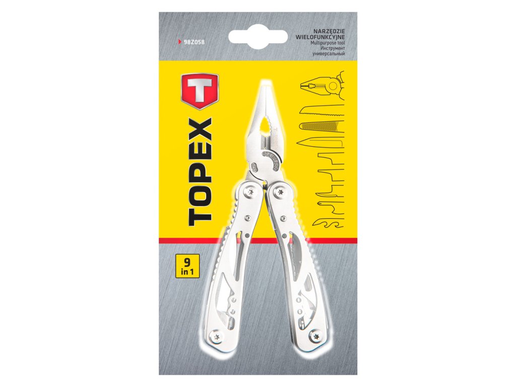multifunkčné náradie TOPEX (ref. 98Z058) s dĺžkou 165 mm. Telo z nehrdzavejúcej ocele zaručuje trvanlivosť a odolnosť voči korózii. V jednom nástroji sa nachádza mnoho rôznych funkcií vrátane najobľúbenejšieho skrutkovača PH2, ostrého noža potrebného v mnohých situáciách a otvárača na konzervy a fľaše, ktorý je potrebný pri mnohých kempovaní. Puzdro z odolného nylonu uľahčuje skladovanie a prepravu. Značka TOPEX je určená pre domácich majstrov.