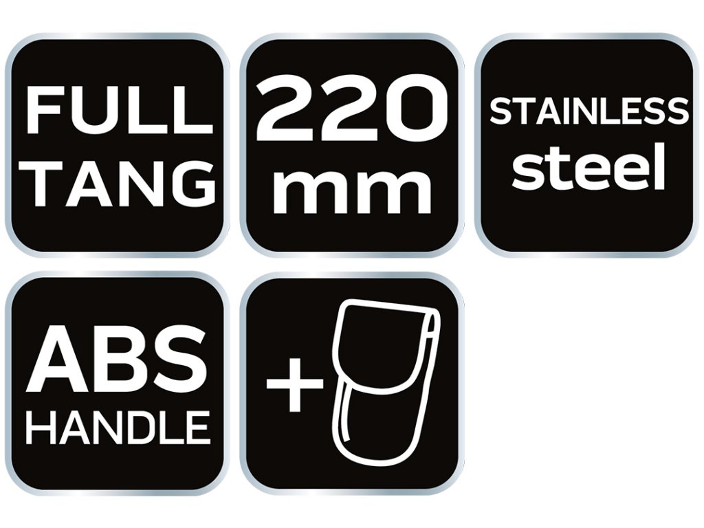 Nôž na prežitie full-tang 22 cm 63-108 dĺžka 22 cm s čepeľou 10,8 cm. Nožík je vyrobený z kvalitnej nehrdzavejúcej ocele s puzdrom na opasok.