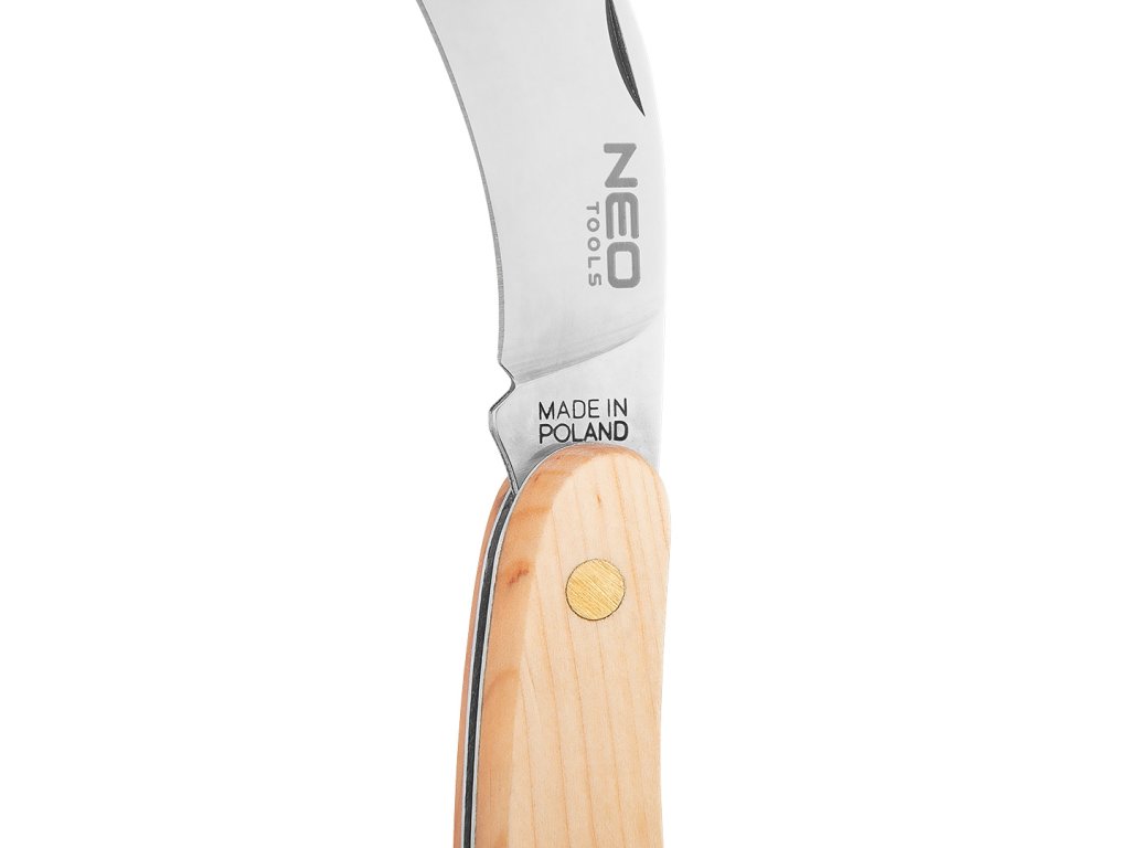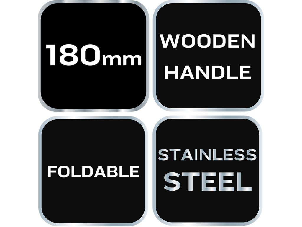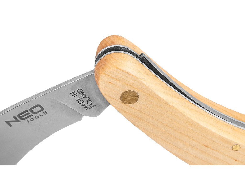 Montážny nôž srp, drevené kryty, skladacie telo, celková dĺžka v otvorenom stave 180 mm, celková dĺžka v zatvorenom stave 100 mm, dĺžka čepele 80 mm, čepeľ z nehrdzavejúcej ocele, oceľové nity, čepeľ s priestorom na ľahké otváranie, rukoväť s drevenými krytmi, druh dreva - jelša, certifikát FSC.