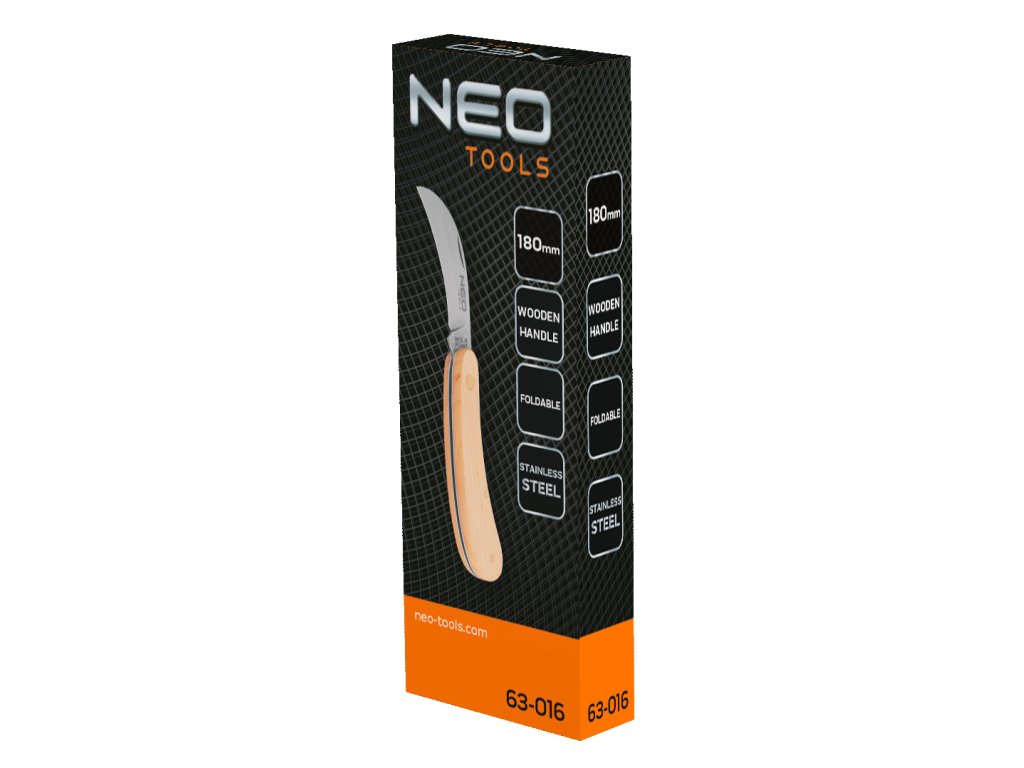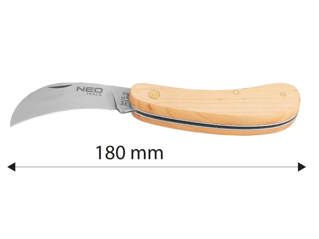 Montážny nôž dlhý 180 mm. Rukoväť s drevenými čapmi. Čepeľ srpu s bezpečnostnou poistkou proti nekontrolovanému otvoreniu.