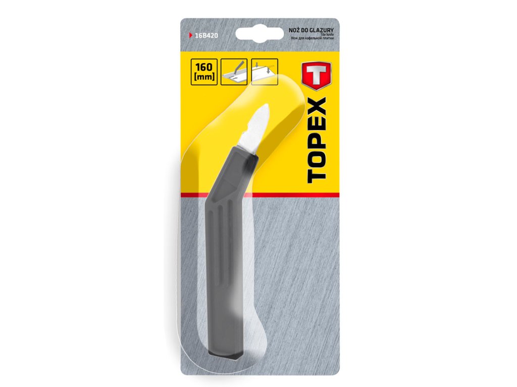 Nôž na obkladačky TOPEX (ref. 16B420) s dĺžkou 160 mm. Využitie nájde pri obkladačských prácach. Rukoväť z pevného plastu dobre padne do ruky, čo zvyšuje pohodlie pri práci. Značka TOPEX je určená pre domácich majstrov.