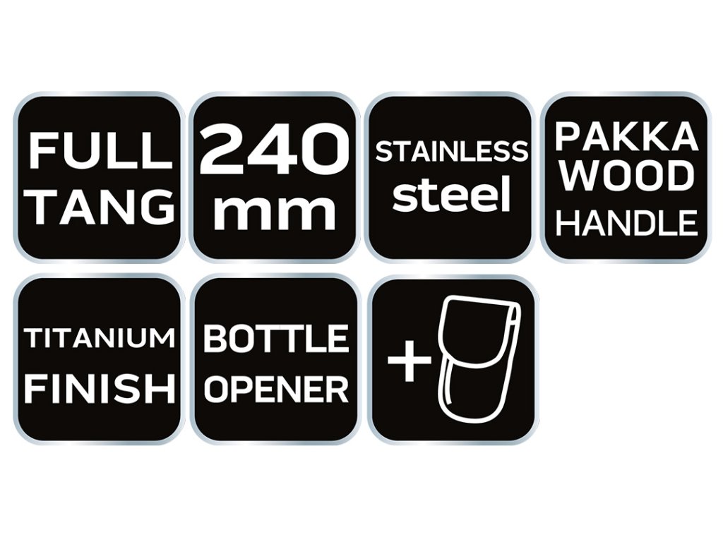Nôž na prežitie full-tang 24 cm, celoplošná konštrukcia, čepeľ 13 cm, drevená rukoväť, nehrdzavejúca oceľ 3Cr13, čepeľ so saténovým poťahom, otvárač na fľaše v čepeli, nylonové vrecko