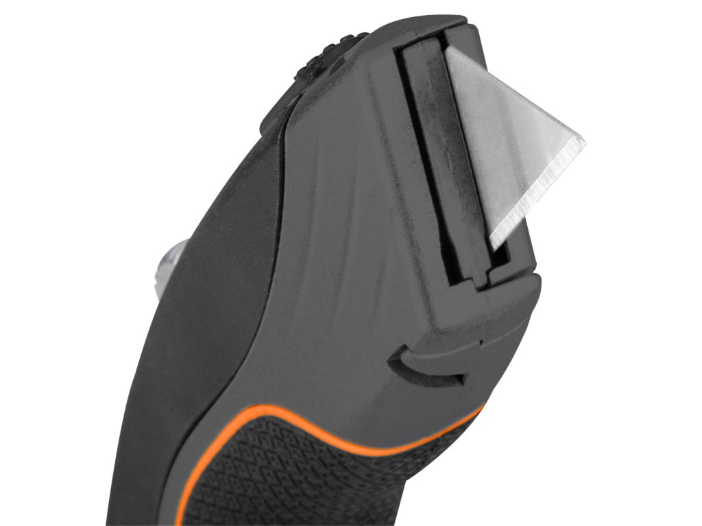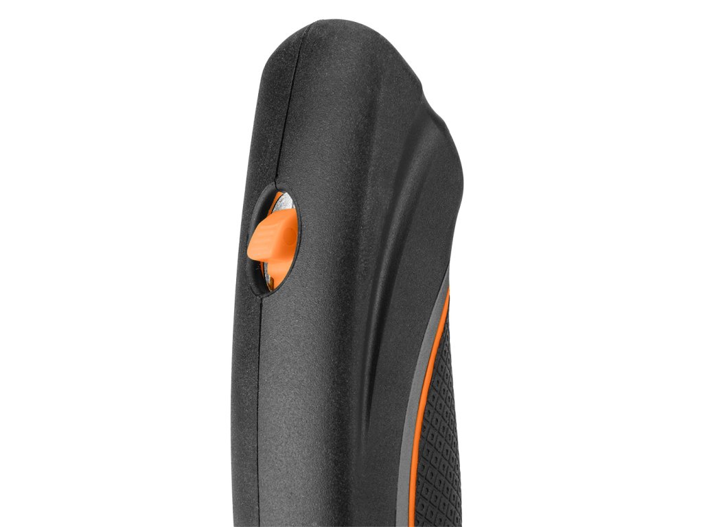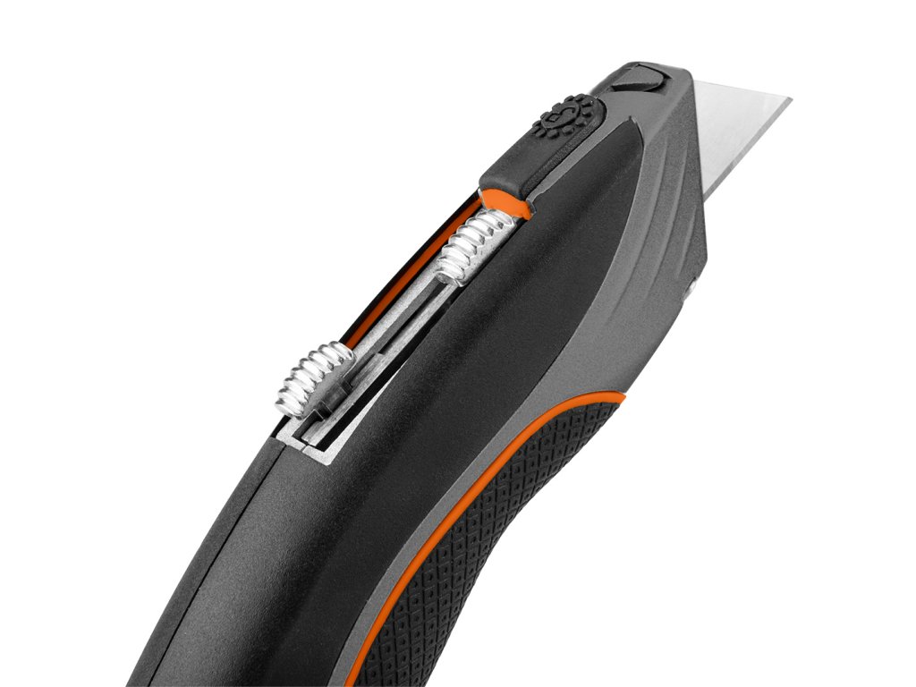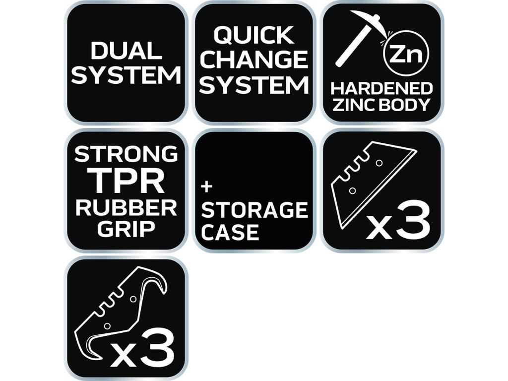Nôž s lichobežníkovou a hákovou čepeľou ľahké a odolné telo zo zinkovej zliatiny, dva druhy čepelí pripravené na použitie (háková a lichobežníková), aretácia čepele, zásobník na náhradné čepele - s aretáciou, 3 hákové čepele (2 náhradné), 3 lichobežníkové čepele (2 náhradné), dvojzložková rukoväť - vrátane TPR pre zvýšený komfort práce, mechanizmus rýchlej a jednoduchej výmeny čepele, rozmer 179x48,5x29mm.