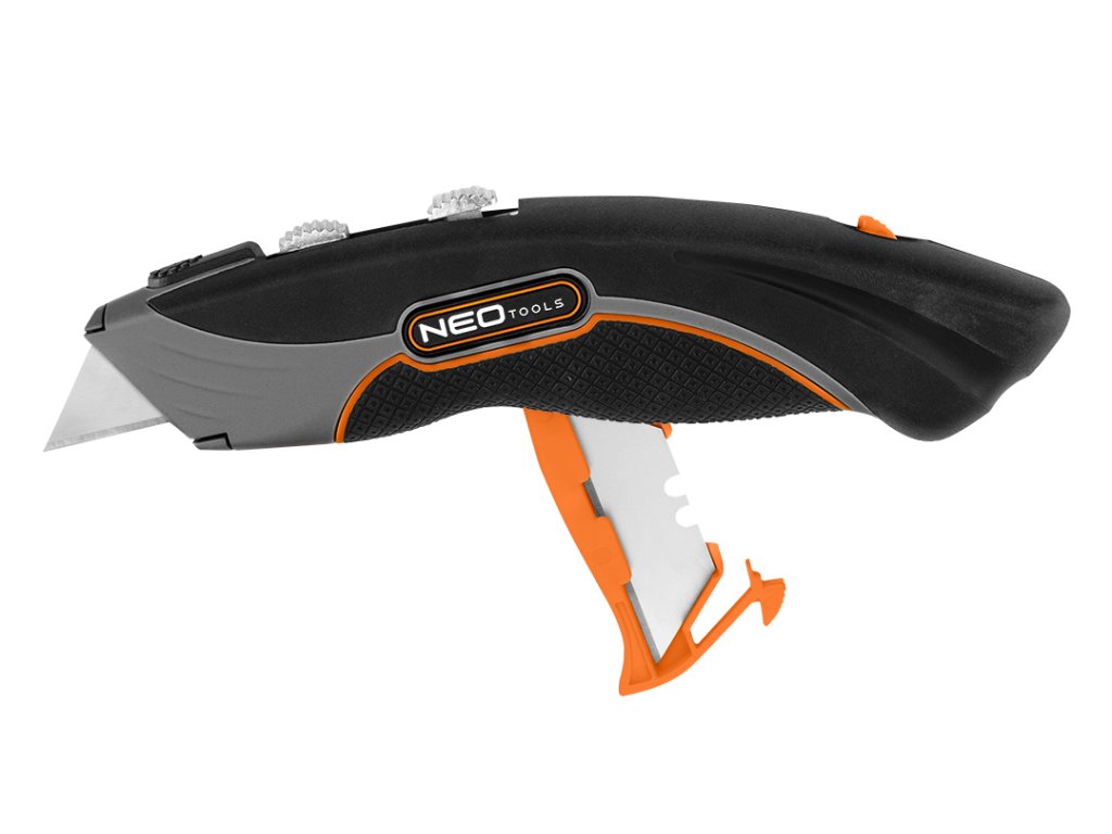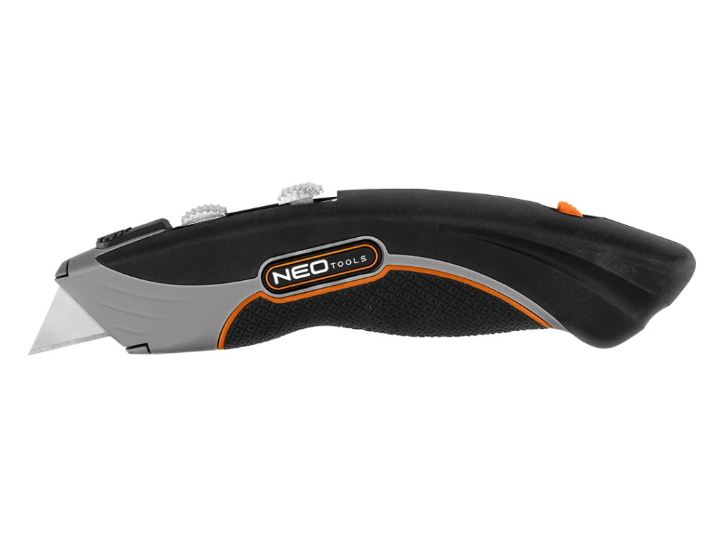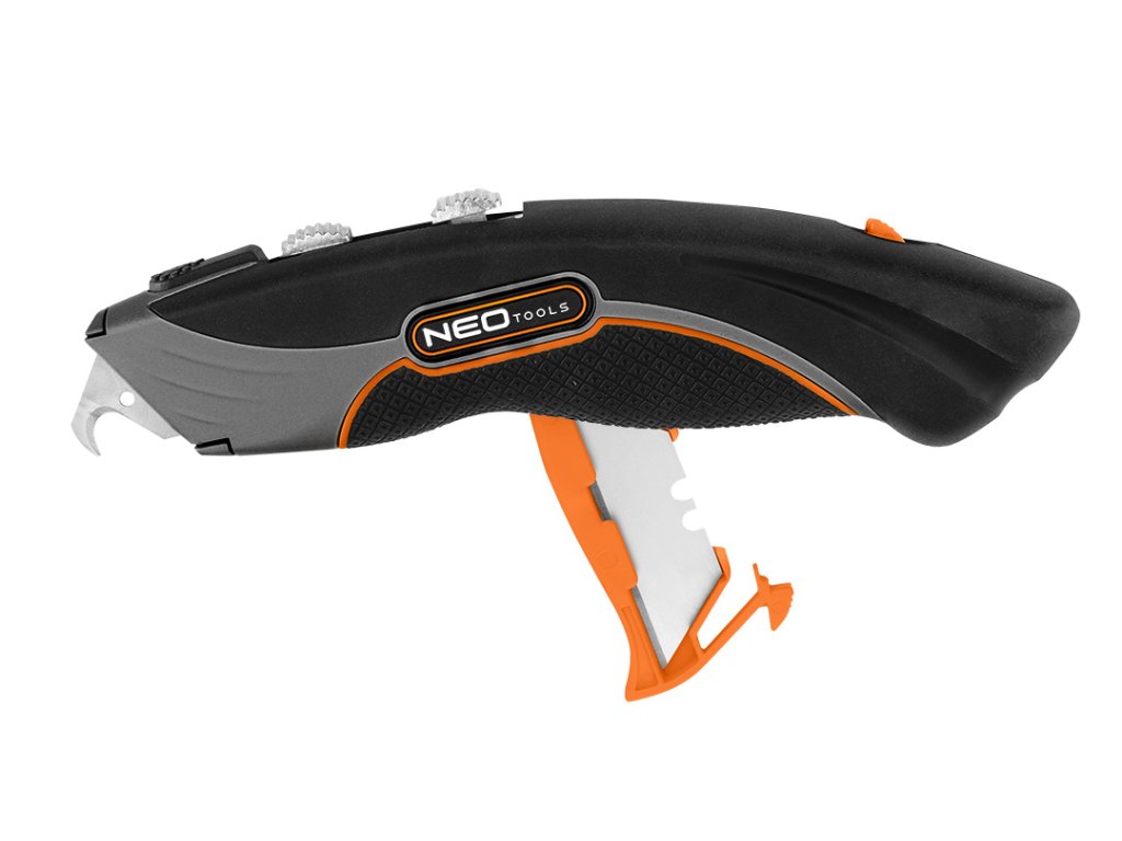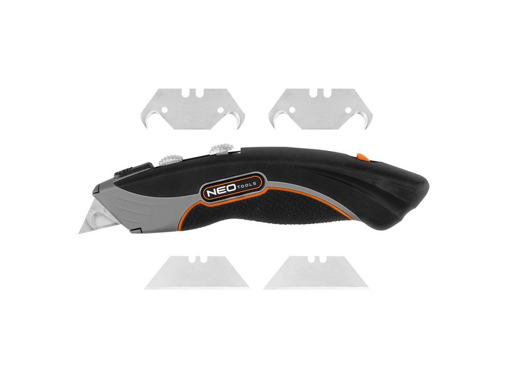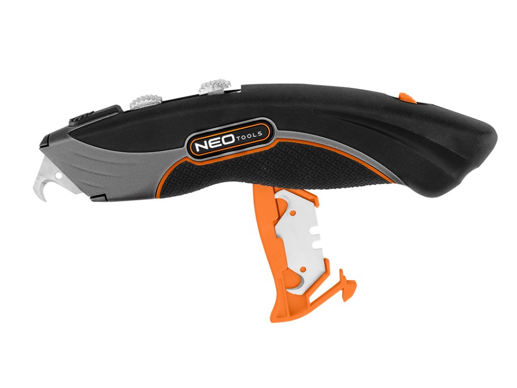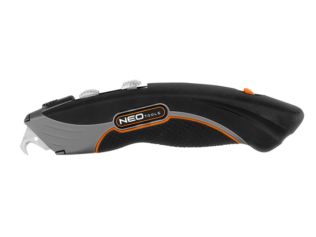 Nôž s lichobežníkovou a hákovou čepeľou, kovové telo 6 čepelí 63-700 od spoločnosti NEO je nôž vybavený duálnym systémom, ktorý ponúka pohotovosť dvoch čepelí - lichobežníkovej a hákovej. Má priehradku na dve čepele a zásobník na náhradné čepele. Kovové telo zo zliatiny zinku prispieva k odolnosti tohto nástroja a rukoväť s povrchovou úpravou ABS+TPR poskytuje protišmykové vlastnosti. Kovové vodiace lišty rýchlo a bez námahy vysunú zvolený nôž z puzdra. Zámok čepele umožňuje správnu stabilizáciu. Nôž sa odporúča na rezanie kobercov, rezanie pások a pásov na balíkoch. Bude užitočná v profesiách skladníka, staviteľa a dokončovača. Sada sa ponúka so 6 čepeľami vrátane 4 prídavných čepelí.