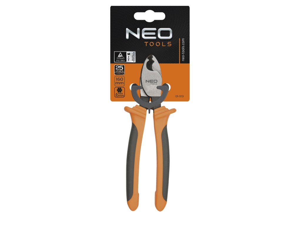 Rezačka na medené a hliníkové káble NEO (ref. 01-513) s veľkosťou 160 mm, vyrobená v súlade s normou DIN 5749. Kalené čeľuste reže do maximálneho priemeru 10 mm. Vysokokvalitná chróm-vanádiová oceľ zaručuje dlhodobú odolnosť čeľustí. Ergonomická rukoväť z dvoch materiálov pre väčšie pohodlie. Kvalitu nástroja potvrdzuje certifikát TÜV a 25-ročná záruka výrobcu. Značka NEO spĺňa očakávania profesionálov.