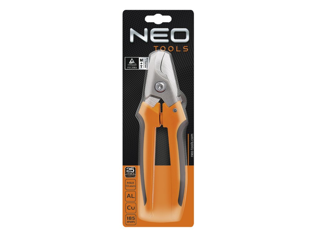 Rezačka na medené a hliníkové káble NEO (ref. 01-510) so srpovitými nožmi, veľkosť 185 mm. Kalené čeľuste reže do maximálneho priemeru 13 mm. Vysokokvalitná legovaná oceľ zaručuje dlhodobú odolnosť čeľustí. Ergonomická rukoväť z dvoch materiálov pre väčšie pohodlie. Kvalitu nástroja potvrdzuje certifikát TÜV a 25-ročná záruka výrobcu. Značka NEO spĺňa očakávania profesionálov.