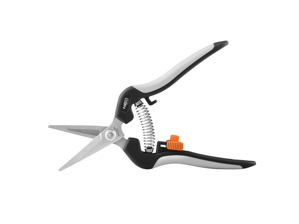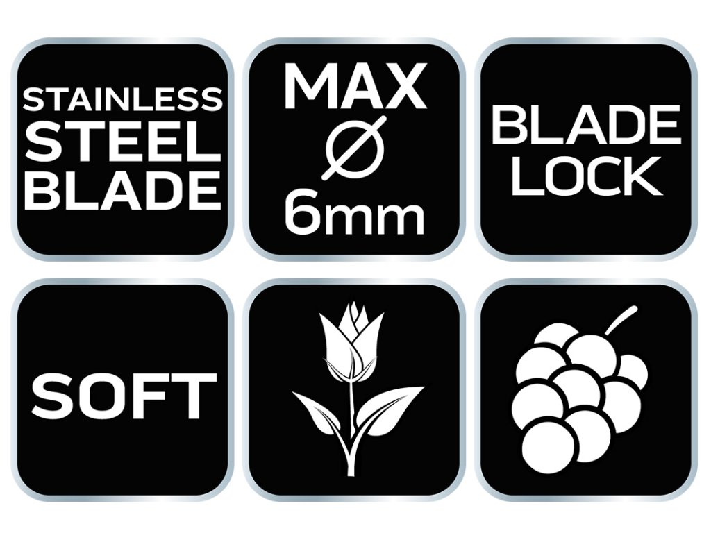 Záhradnícke nožnice na mladé výhonky, celková dĺžka 185 mm, maximálny priemer strihu 6 mm, čepeľ z tvrdenej a temperovanej nehrdzavejúcej ocele, čepele s mikroostričkami sú ideálne na záhradnícke práce: ovocné kvety, bonsaje, izbové rastliny a kvetinové aranžmány; ergonomická rukoväť s mäkkými prvkami,