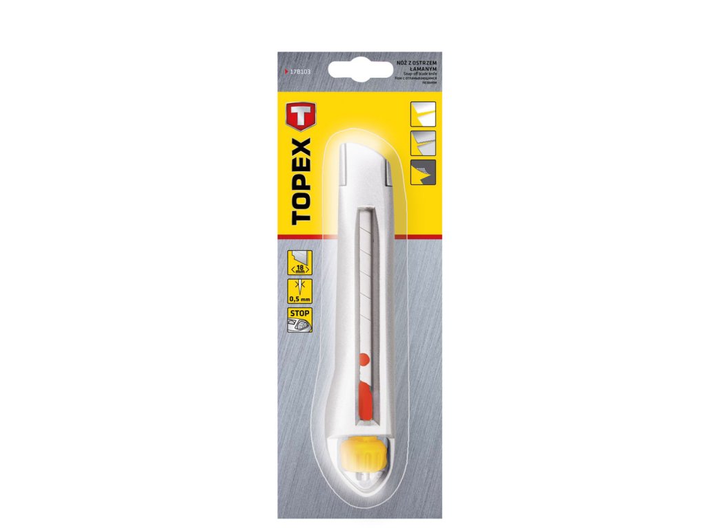 TOPEX skladací nôž (ref. 17B103) na použitie s 18 mm širokou čepeľou. Veľmi užitočné na mechanické práce a kutilstvo. Kovové telo zaručuje dlhú životnosť. Prídavná poistka skrutky uľahčuje prácu s náradím. Vďaka ergonomickému tvaru sa nôž dobre drží v ruke. Značka TOPEX je určená pre domácich majstrov.
