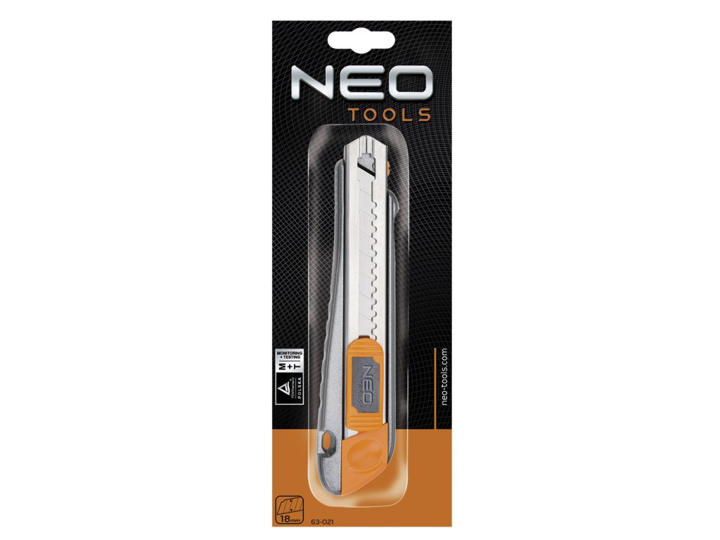 Nôž NEO s odlamovacou čepeľou (ref. 63-021) na použitie s čepeľou širokou 18 mm. Kovové vedenie a pevná kovová konštrukcia tela zabezpečujú dlhú životnosť nástroja a umožňujú silné rezanie. Odlamovač nožov a zásobník na 5 náhradných nožov sú ďalším príslušenstvom, ktoré uľahčuje prácu. Ergonomický tvar rukoväte zaručuje pohodlie a bezpečnosť pri používaní. Certifikát TÜV Rheinland je zárukou vysokej kvality a spoľahlivosti výrobku. Značka NEO spĺňa očakávania profesionálov.