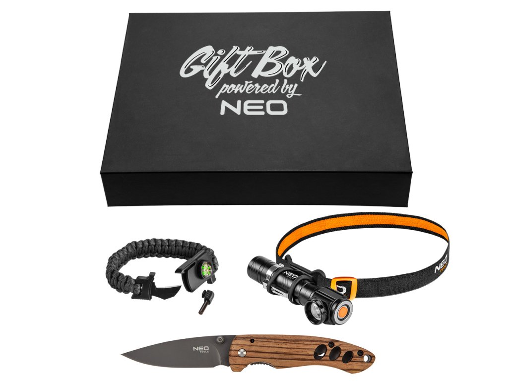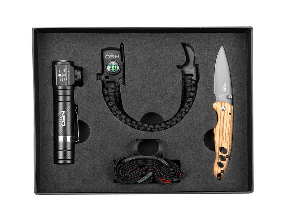 Trojdielna súprava (čelová baterka 99-026, náramok na prežitie 5 v 1 63-140, skladací nôž) 63-033 od spoločnosti NEO je súprava, ktorá sa okrem iného skladá z čelovej baterky 99-026 NEO s dobíjacou baterkou s výkonom 10 W a maximálnym svetelným tokom 800 lúmenov. Má dosah až 150 m a zabudovanú diódu Cree XML T6. Má zoom a 3 svetelné funkcie: 100 %, 50 % a stroboskop. Je napájaný 3,7-mililitrovou batériou s kapacitou 1200 mAh a nabíja sa pomocou USB, pričom zástrčka sa nachádza pod krytom. Čas nabíjania je 4 h, zatiaľ čo čas prevádzky je maximálne 3 h. Baterka je vybavená čelenkou. Vďaka tomu, že sa dá vybrať z držiakov, má širšie využitie. Ponúka vreckový klip.