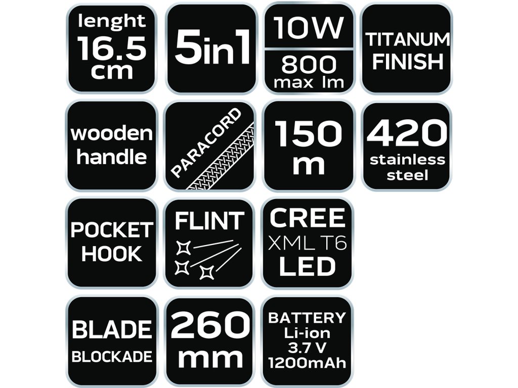 Sada 3 prvkov (čelová baterka 99-026, náramok na prežitie 5 v 1 63-140, skladací nôž) Čelová baterka 99-026 nabíjateľná NEO výkon 10W, max. 800 lúmenov, dosah max. 150m, LED Cree XML T6, zoom, batéria 1200mah 3. 7 Li-ion, nabíjanie cez USB, zástrčka pod viečkom, IP 20, doba nabíjania 4 h, pracovný čas max. 3 h, čelenka, odnímateľná z rukoväte, vreckový klip, 3 svetelné funkcie 100%, 50%, stroboskop. Náramok na prežitie 63-140 - 5 v 1 obsahuje paracordové lano, kremeň, kompas, nôž, píšťalku. Lano 3,5 m, pevnosť 250 kg, šírka náramku 26 mm, obvod 240 mm, kremeň 5x20 mm, zelená farba. Nôž - dĺžka 16,5 cm, drevená rukoväť, nerezová oceľ 420, titánová povrchová úprava čepele, vreckový klip, poistka čepele