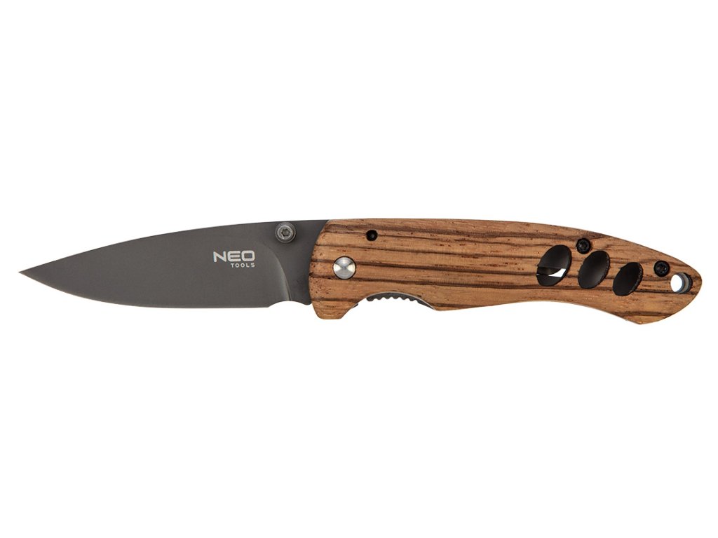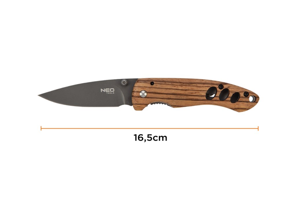 Tretím prvkom v súprave je 16,5 cm dlhý nôž. Je vybavený drevenou rukoväťou a čepeľou z nehrdzavejúcej ocele - bude užitočný v mnohých situáciách. Titánový povlak čepele ju spevňuje a poistka čepele ovplyvňuje bezpečnosť používania. Vreckový klip umožňuje pohodlné pripevnenie nástroja k odevu.